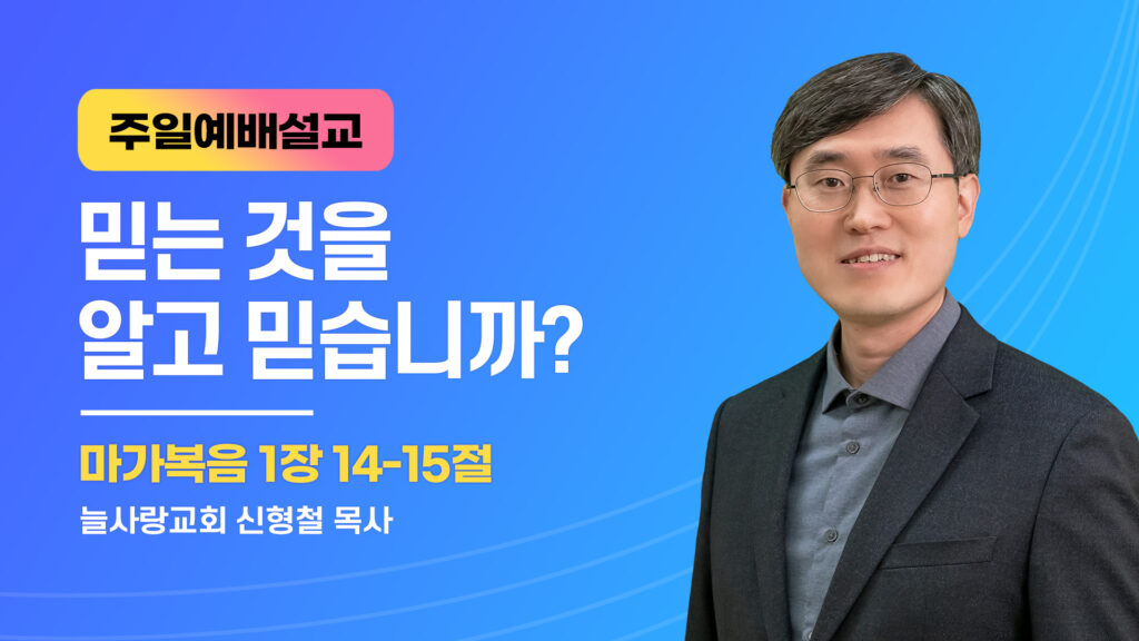 2023년 2월 26일 주일예배 설교 By 신형철목사주일설교No Comments Play VideoPlay Video 본문 : 마가복음 1장 14-15절 제목 : 믿는 것을 아십니까? 14. 요한이 잡힌 후 예수께서 갈릴리에 오셔서 하나님의 복음을 전파하여 15. 이르시되 때가 찼고 하나님의 나라가 가까이...Read More 2023년 3월 6일 Love0