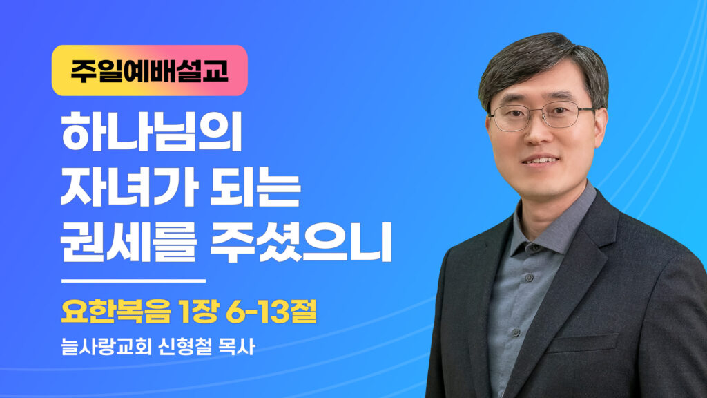 Play VideoPlay Video 본문 : 요한복음 1장 6-13절 제목 : 하나님의 자녀가 되는 권세를 주셨으니 [요1:6-13] 6 하나님께로부터 보내심을 받은 사람이 있으니 그의 이름은 요한이라 7 그가 증언하러 왔으니 곧...