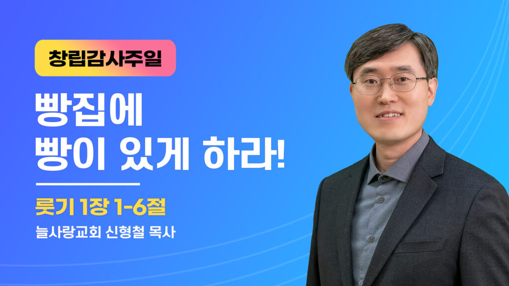 2022년 3월 13일 창립주일예배 설교 By 신형철목사주일설교No Comments Play VideoPlay Video 본문 : 룻기 1:1-6 제목 : 빵집에 빵이 있게 하라! 1. 사사들이 치리하던 때에 그 땅에 흉년이 드니라 유다 베들레헴에 한 사람이 그의 아내와 두 아들을 데리고...Read More 2022년 3월 26일 Love0