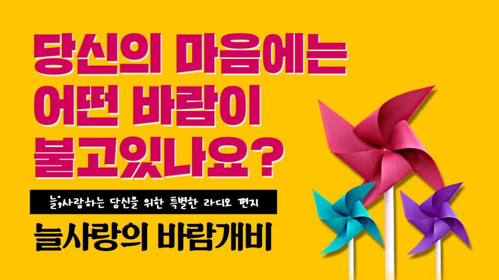 늘사랑의 바람개비 – 2021년 5월 5일 라디오 방송 By 신형철목사늘사랑의 바람개비No Comments Play VideoPlay Video 늘사랑의 바람개비 당신의 마음에는 어떤 바람이 불고 있나요? 늘;사랑하는 당신을 위한 특별한 라디오 편지! 늘사랑의 바람개비 매주 수요일 저녁 7시 30분. 우리를 향한 하나님의 바람을 담아, 하나님을...Read More 2021년 5월 9일 Love0