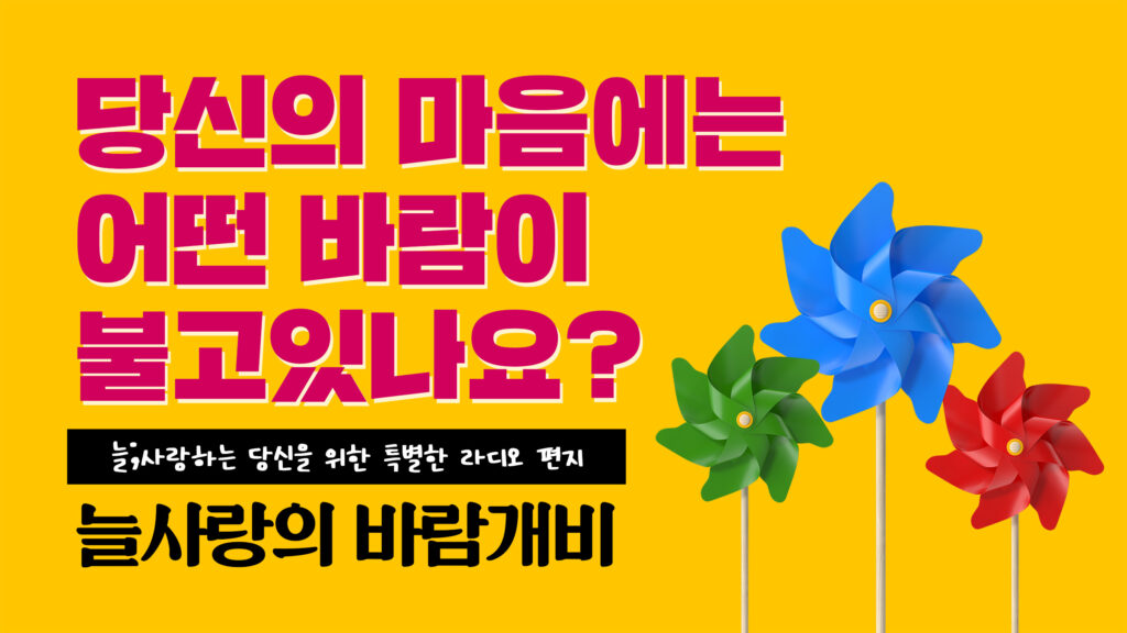 늘사랑의 바람개비 – 2021년 4월 28일 라디오 방송 By 신형철목사늘사랑의 바람개비No Comments Play VideoPlay Video 늘사랑의 바람개비 당신의 마음에는 어떤 바람이 불고 있나요? 늘;사랑하는 당신을 위한 특별한 라디오 편지! 늘사랑의 바람개비 매주 수요일 저녁 7시 30분. 우리를 향한 하나님의 바람을 담아, 하나님을...Read More 2021년 4월 29일 Love0