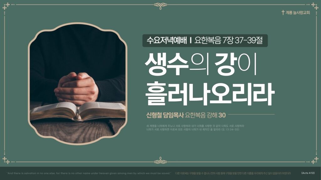 2023년 10월 18일 수요예배 설교 By 늘사랑수요예배설교No Comments Play VideoPlay Video 본문 : 요한복음 7장 37-39절 제목 : 생수의 강이 흘러나오리라 37 명절 끝날 곧 큰 날에 예수께서 서서 외쳐 이르시되 누구든지 목마르거든 내게로 와서 마시라 38 나를...Read More 2023년 10월 20일 Love0