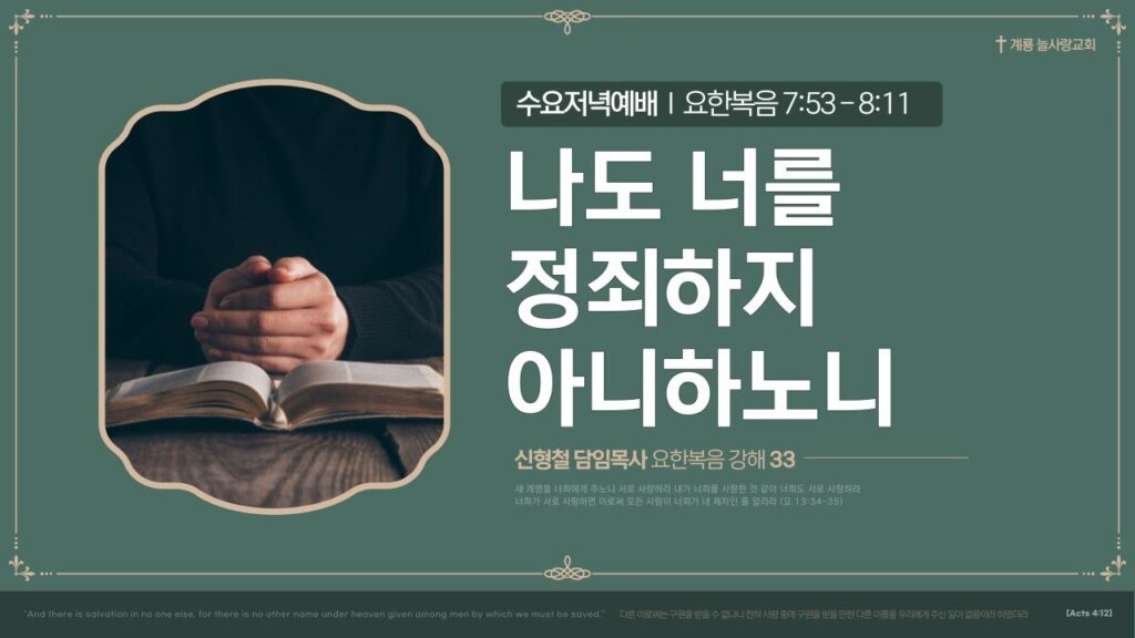 2023년 11월 8일 수요예배 설교 By 늘사랑수요예배설교No Comments Play VideoPlay Video 본문 : 요한복음 7장 53절 - 8장 11절 제목 : 나도 너를 정죄하지 아니하노니 요한복음 7장 53 다 각각 집으로 돌아가고 요한복음 8장 1 예수는 감람 산으로...Read More 2023년 11월 12일 Love0