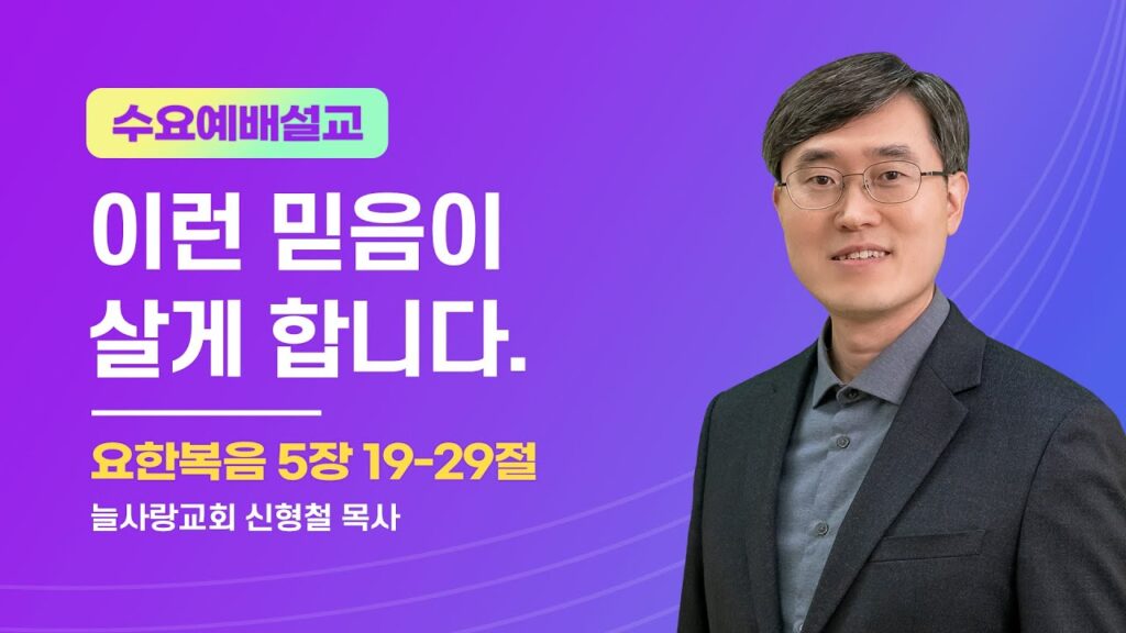 2023년 7월 12일 수요예배 설교 By 늘사랑수요예배설교No Comments Play VideoPlay Video 본문 : 요한복음 5장 19-29절 제목 : 이런 믿음이 살게합니다. 19 그러므로 예수께서 그들에게 이르시되 내가 진실로 진실로 너희에게 이르노니 아들이 아버지께서 하시는 일을 보지 않고는 아무...Read More 2023년 7월 16일 Love0