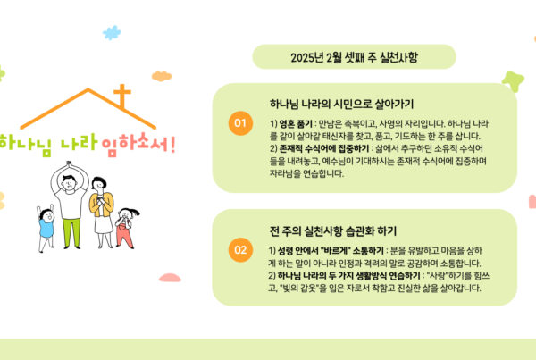 2월 셋째 주 <늘사랑 하나님 나라 실천사항>을 나눕니다. - 이번 주 실천사항은 "하나님 나라의 시민으로 살아가기"입니다. 1) 영혼 품기 : 만남은 축복이고, 사명의 자리입니다. 하나님 나라를 같이 살아갈 태신자들을 찾고,…