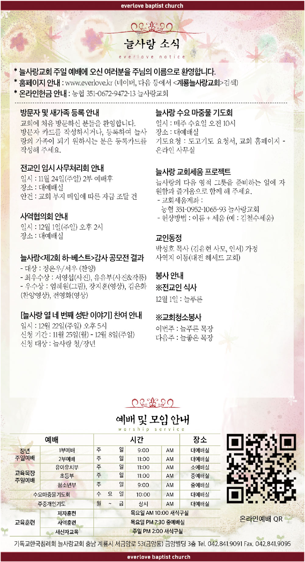 말씀이 삶이되는 늘사랑교회 늘사랑의 다양한 소식들을 전해 드립니다. 예배 순서와 말씀 본문도 보실 수 있습니다. 진행되는 사역들을 위해 함께 기도해 주세요. Tags:[늘사랑 열 네 번재 성탄 이야기] 참여 안내11월 24일(주일) 2부 예배후경배하리교인동정내 눈 주의 영광을 보네너를 위하여 우상을 만들지 말라늘사랑 감사 공모전 결과박성호 목사(김유현 사모사역협의회 안내영광을 돌리세인서)가정 사역지 이동전교인 임시 사무처리회 안내주 여호와는 광대하시도다출애굽기 20잘 4-6절