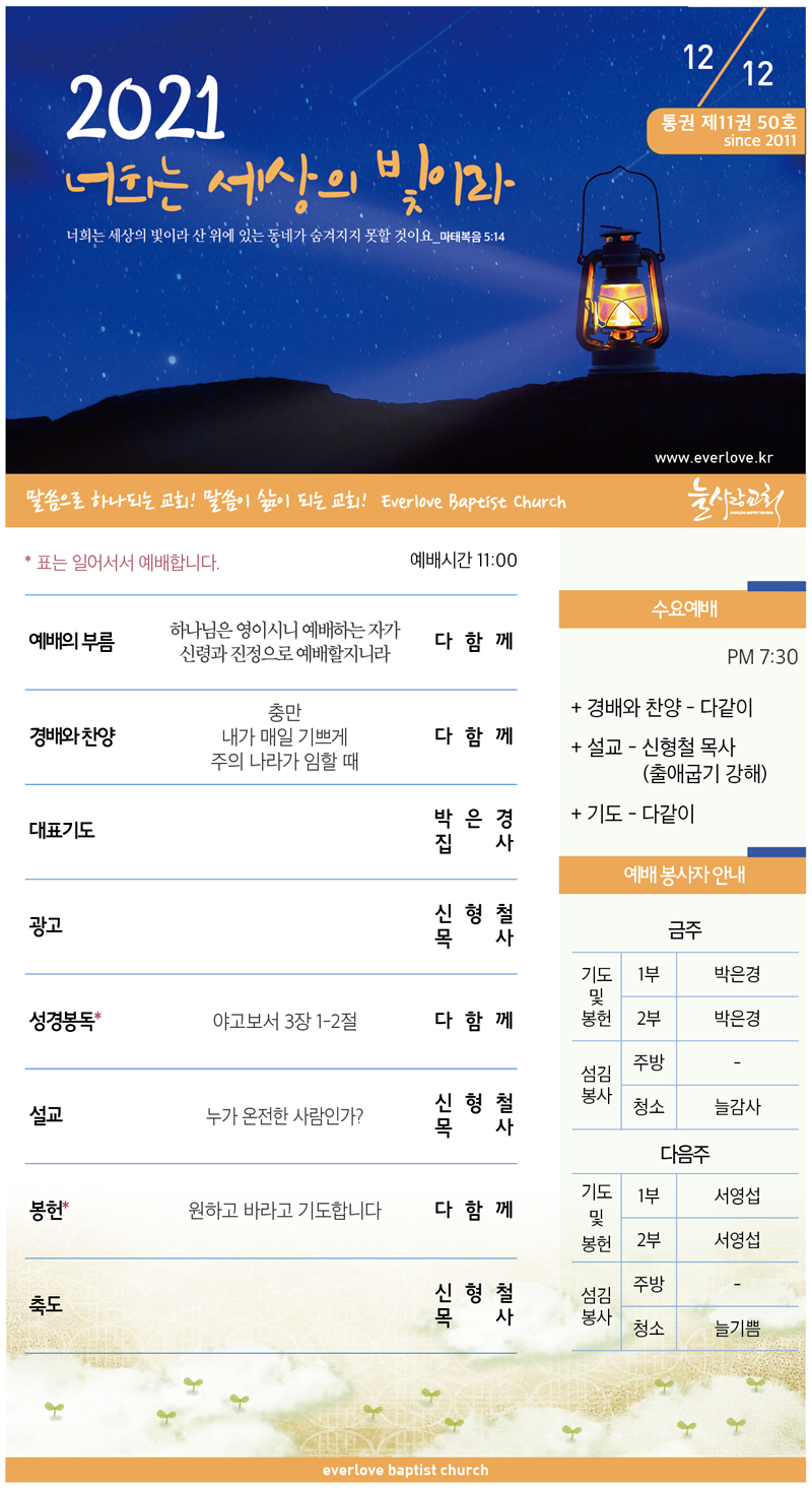 말씀이 삶이되는 늘사랑교회 늘사랑의 다양한 소식들을 전해 드립니다. 예배 순서와 말씀 본문도 보실 수 있습니다. 진행되는 사역들을 위해 함께 기도해 주세요. Tags:12월2021년2022계룡교회내가 매일 기쁘게늘사랑리더모임모임사역지원소식수요저녁예배안내원하고 바라고 기도합니다주의 나라가 임할 때충만행사