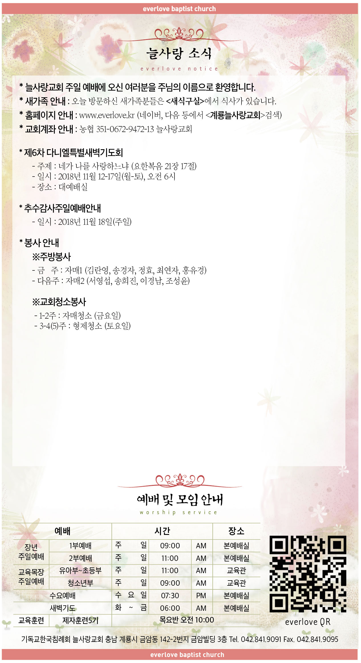 말씀이 삶이되는 늘사랑교회 늘사랑의 다양한 소식들을 전해 드립니다. 예배 순서와 말씀 본문도 보실 수 있습니다. 진행되는 사역들을 위해 함께 기도해 주세요. Tags:20186차계룡교회늘사랑다니엘소식추수감사주일특별새벽기도회