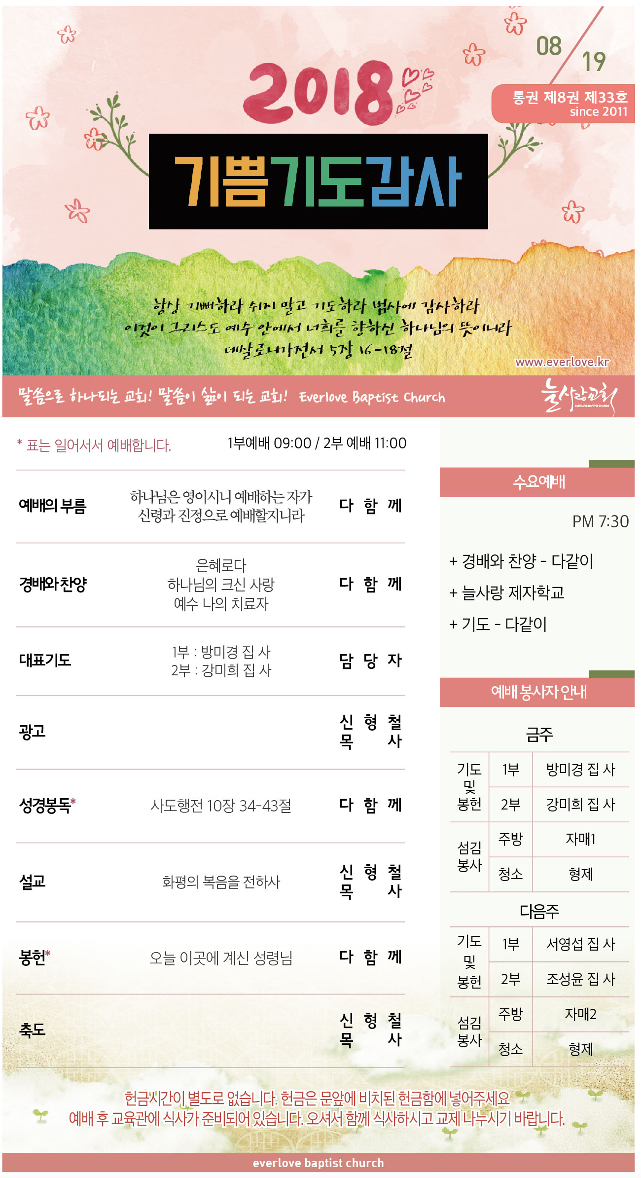 말씀이 삶이되는 늘사랑교회 늘사랑의 다양한 소식들을 전해 드립니다. 예배 순서와 말씀 본문도 보실 수 있습니다. 진행되는 사역들을 위해 함께 기도해 주세요. Tags:20185기강좌개강교회만찬먼쓰목장새식구소식수요제자훈련침례식캐쥬얼