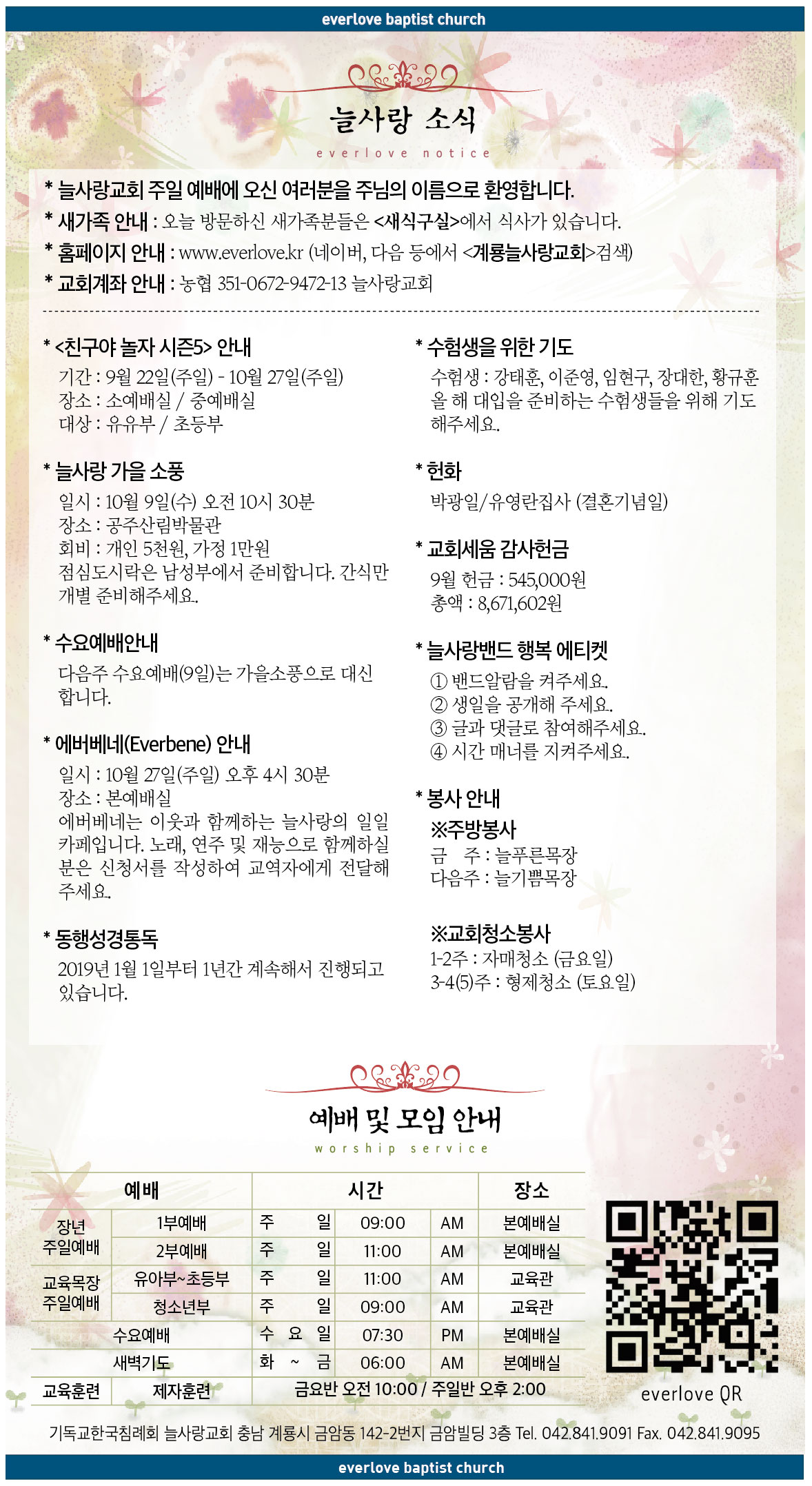 말씀이 삶이되는 늘사랑교회 늘사랑의 다양한 소식들을 전해 드립니다. 예배 순서와 말씀 본문도 보실 수 있습니다. 진행되는 사역들을 위해 함께 기도해 주세요. Tags:2019가을소풍감사헌금계룡교회교회세움교회소식늘사랑늘사랑밴드동행성경통독수요예배수험생시즌5에버베네친구야놀자행복에티켓헌화
