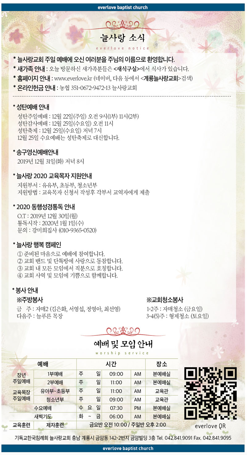 말씀이 삶이되는 늘사랑교회 늘사랑의 다양한 소식들을 전해 드립니다. 예배 순서와 말씀 본문도 보실 수 있습니다. 진행되는 사역들을 위해 함께 기도해 주세요. Tags:20192020교육목자지원교회늘사랑동행성경통독성탄예배소식송구영신예배예수 예수오직예수주 예수보다 더 귀한 것은 없네천사들의 노래가행복캠페인