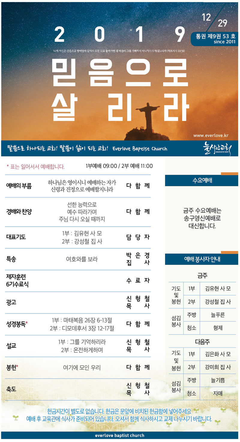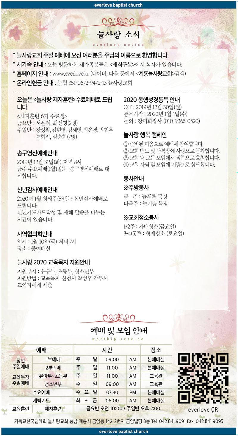 말씀이 삶이되는 늘사랑교회 늘사랑의 다양한 소식들을 전해 드립니다. 예배 순서와 말씀 본문도 보실 수 있습니다. 진행되는 사역들을 위해 함께 기도해 주세요. Tags:20192020교육목자지원교회늘사랑동행성경통독사역협의회선한 능력으로소식송구영신예배신년감사예배예수 따라가면제자훈련6기제자훈련수료예배주님 다시 오실 때까지