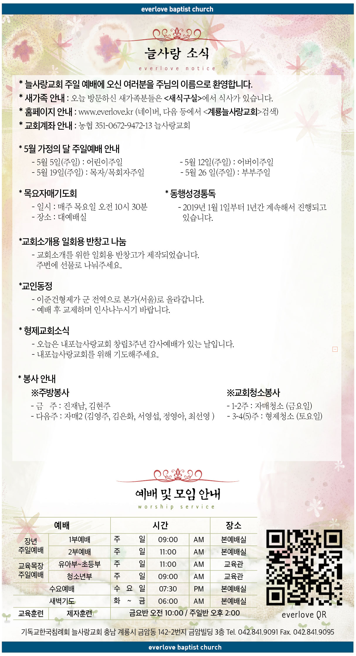 말씀이 삶이되는 늘사랑교회 늘사랑의 다양한 소식들을 전해 드립니다. 예배 순서와 말씀 본문도 보실 수 있습니다. 진행되는 사역들을 위해 함께 기도해 주세요. Tags:20195월가정의달계룡교인동정교회소개용교회소식내포늘사랑늘사랑교회동행성경통독목요자매기도회반창고일회용형제교회