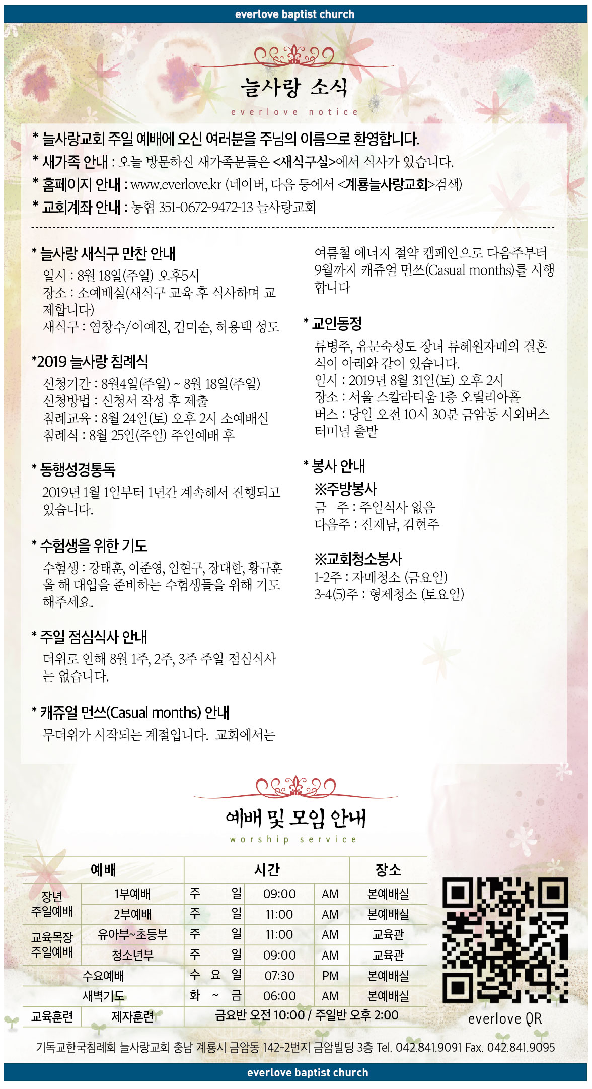 말씀이 삶이되는 늘사랑교회 늘사랑의 다양한 소식들을 전해 드립니다. 예배 순서와 말씀 본문도 보실 수 있습니다. 진행되는 사역들을 위해 함께 기도해 주세요. Tags:2019결혼계룡교인동정교회소식늘사랑교회동행성경통독새식구만찬수험생점심식사침례식캐쥬얼먼쓰