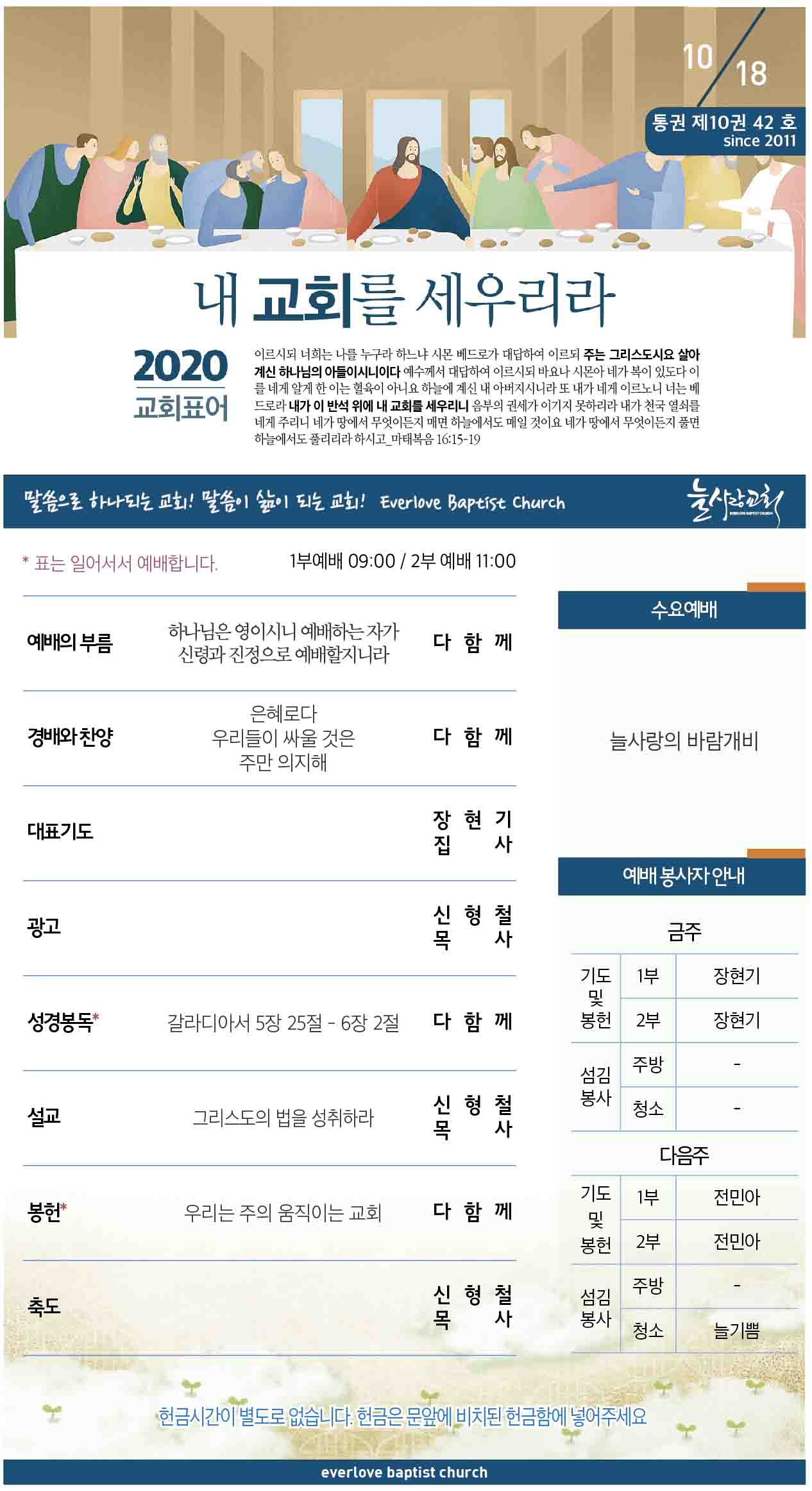 말씀이 삶이되는 늘사랑교회 늘사랑의 다양한 소식들을 전해 드립니다. 예배 순서와 말씀 본문도 보실 수 있습니다. 진행되는 사역들을 위해 함께 기도해 주세요. Tags:2020년계룡교회소식늘사랑교회돌;보아라디오모임바람개비방역수칙수험생예배안내우리는 주의 움직이는 교회우리들이 싸울 것은은혜로다주만 의지해