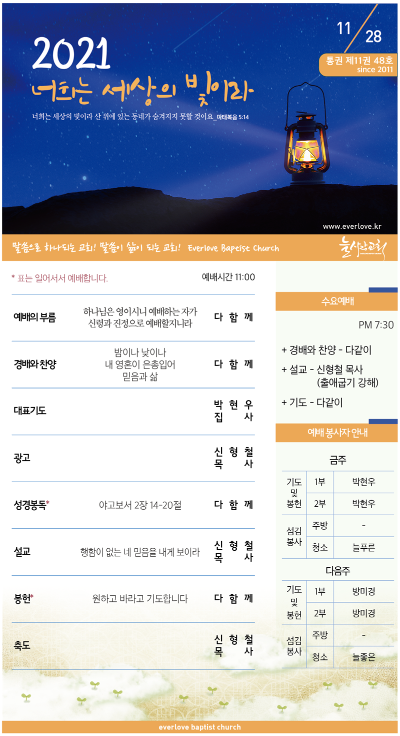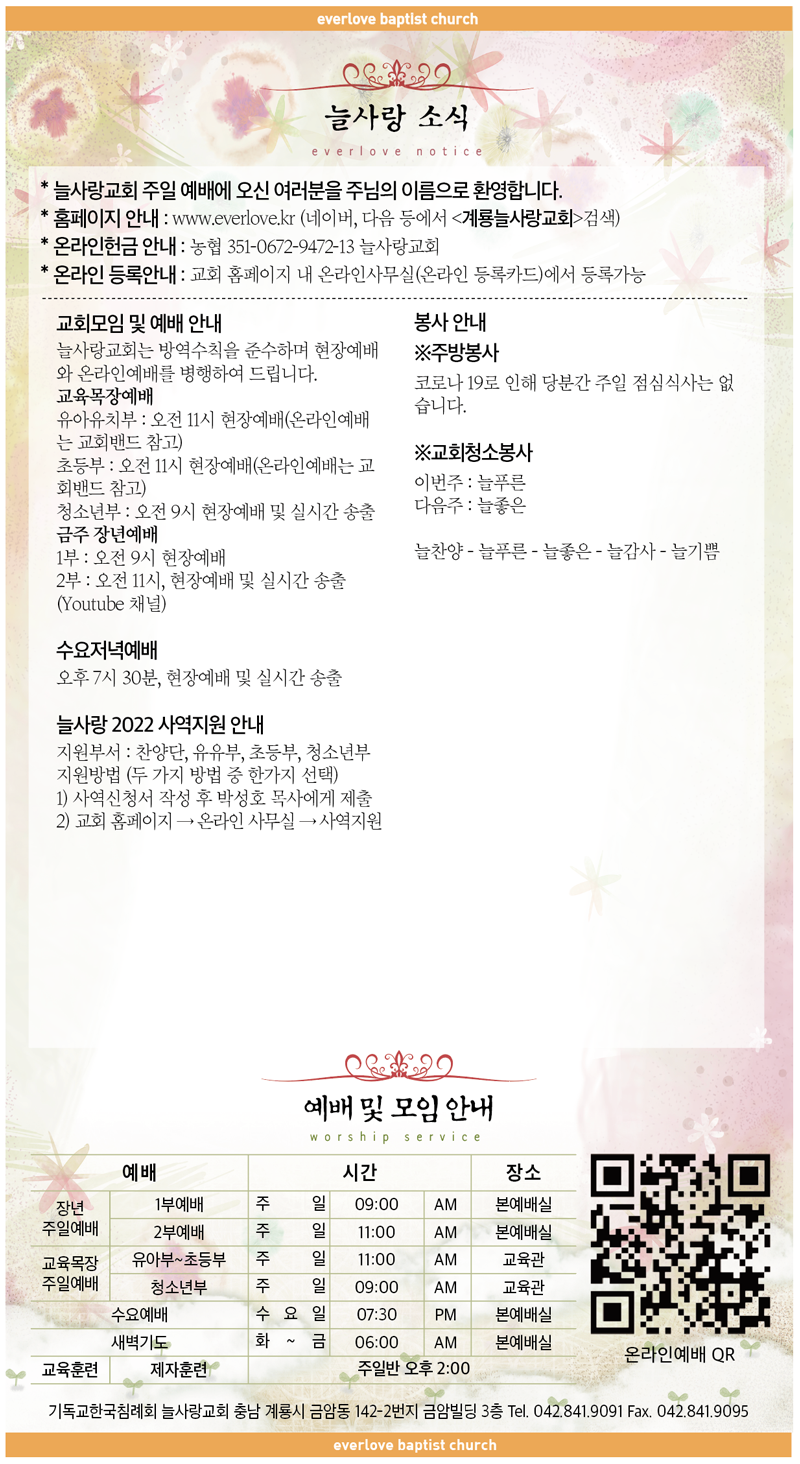 말씀이 삶이되는 늘사랑교회 늘사랑의 다양한 소식들을 전해 드립니다. 예배 순서와 말씀 본문도 보실 수 있습니다. 진행되는 사역들을 위해 함께 기도해 주세요. Tags:2021년2022계룡교회내 영혼이 은총입어늘사랑믿음과 삶밤이나 낮이나사역지원소식수요저녁예배원하고 바라고 기도합니다