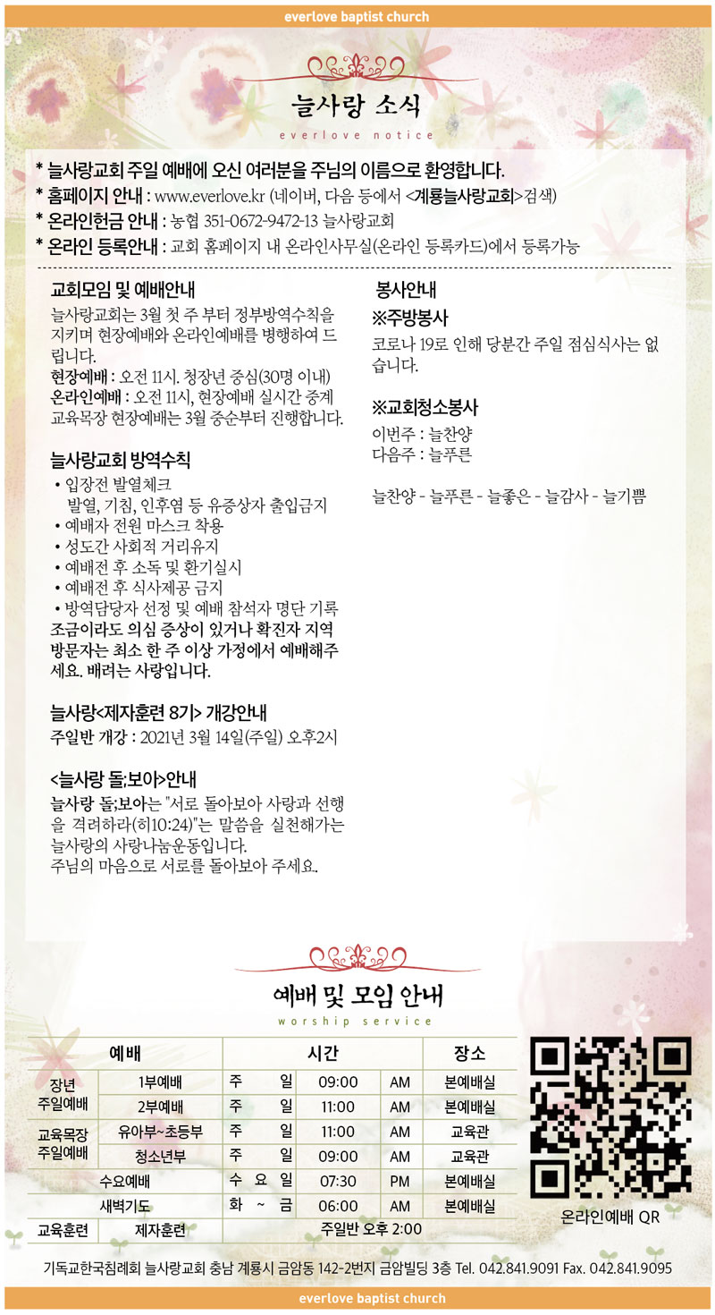 말씀이 삶이되는 늘사랑교회 늘사랑의 다양한 소식들을 전해 드립니다. 예배 순서와 말씀 본문도 보실 수 있습니다. 진행되는 사역들을 위해 함께 기도해 주세요. Tags:2021년8기개강계룡교회늘사랑대단한 믿음 없어도돌;보아마음속에 근심있는 사람모임방역수칙소식예배안내원하고 바라고 기도합니다제자훈련주만 의지해
