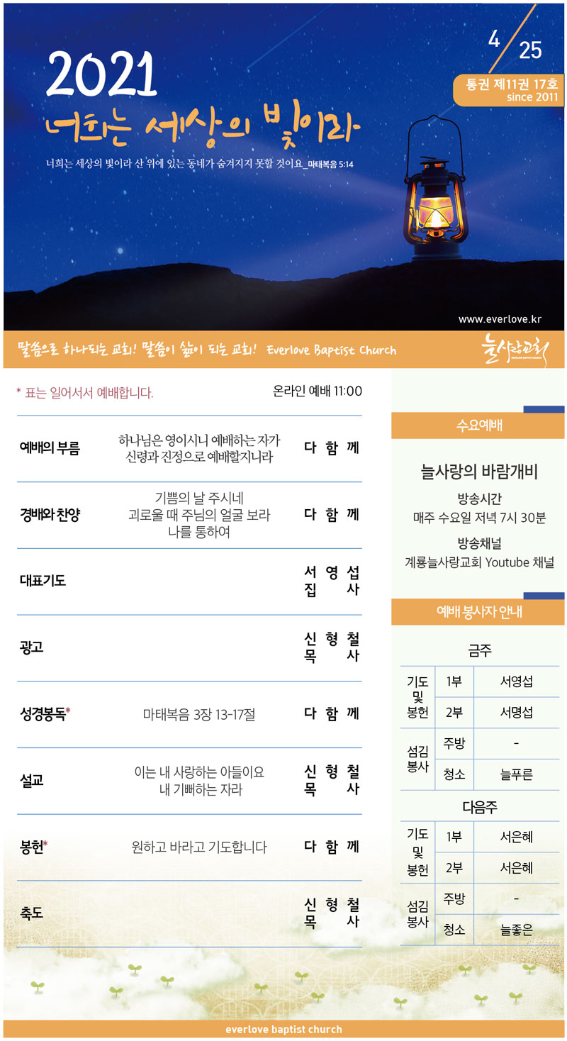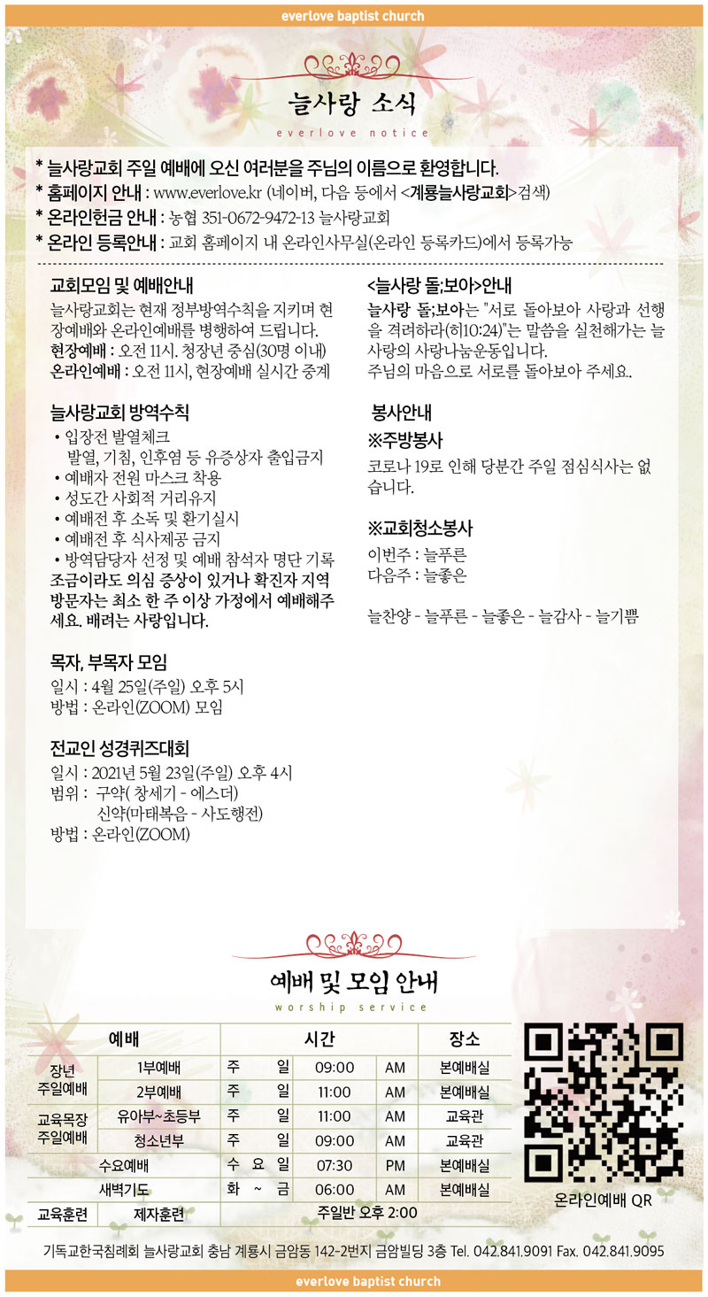말씀이 삶이되는 늘사랑교회 늘사랑의 다양한 소식들을 전해 드립니다. 예배 순서와 말씀 본문도 보실 수 있습니다. 진행되는 사역들을 위해 함께 기도해 주세요. Tags:2021년계룡괴로울 때 주님의 얼굴 보라교회기쁨의 날 주시네나를 통하여늘사랑돌;보아모임목자방역수칙부목자성경퀴즈대회소식원하고 바라고 기도합니다전교인