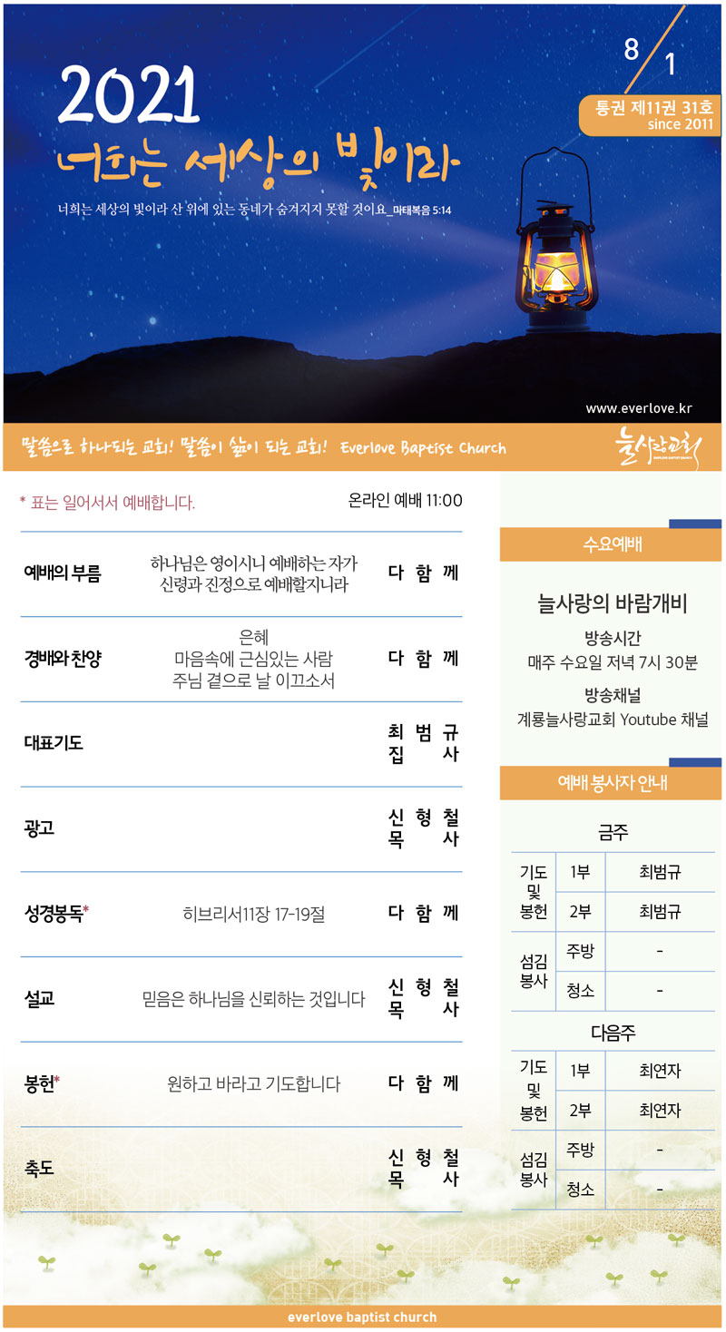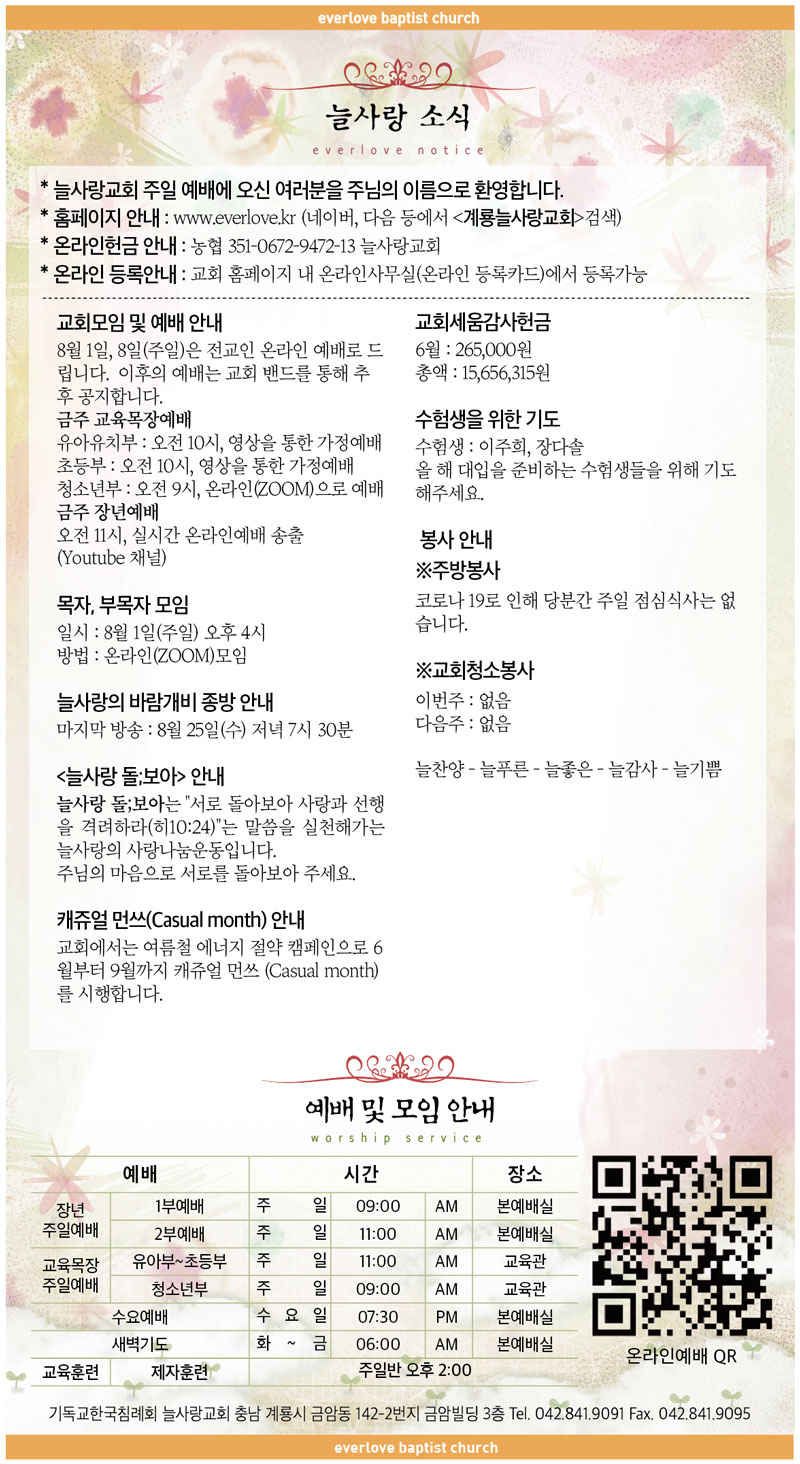 교 말씀이 삶이되는 늘사랑교회 늘사랑의 다양한 소식들을 전해 드립니다. 예배 순서와 말씀 본문도 보실 수 있습니다. 진행되는 사역들을 위해 함께 기도해 주세요. Tags:2021년계룡교회모임교회세움감사헌금교회소식늘사랑돌;보아마음속에 근심있는 사람모임목자바람개비부목자수험생예배안내원하고 바라고 기도합니다은혜종방주님 곁으로 날 이끄소서캐쥬얼먼쓰
