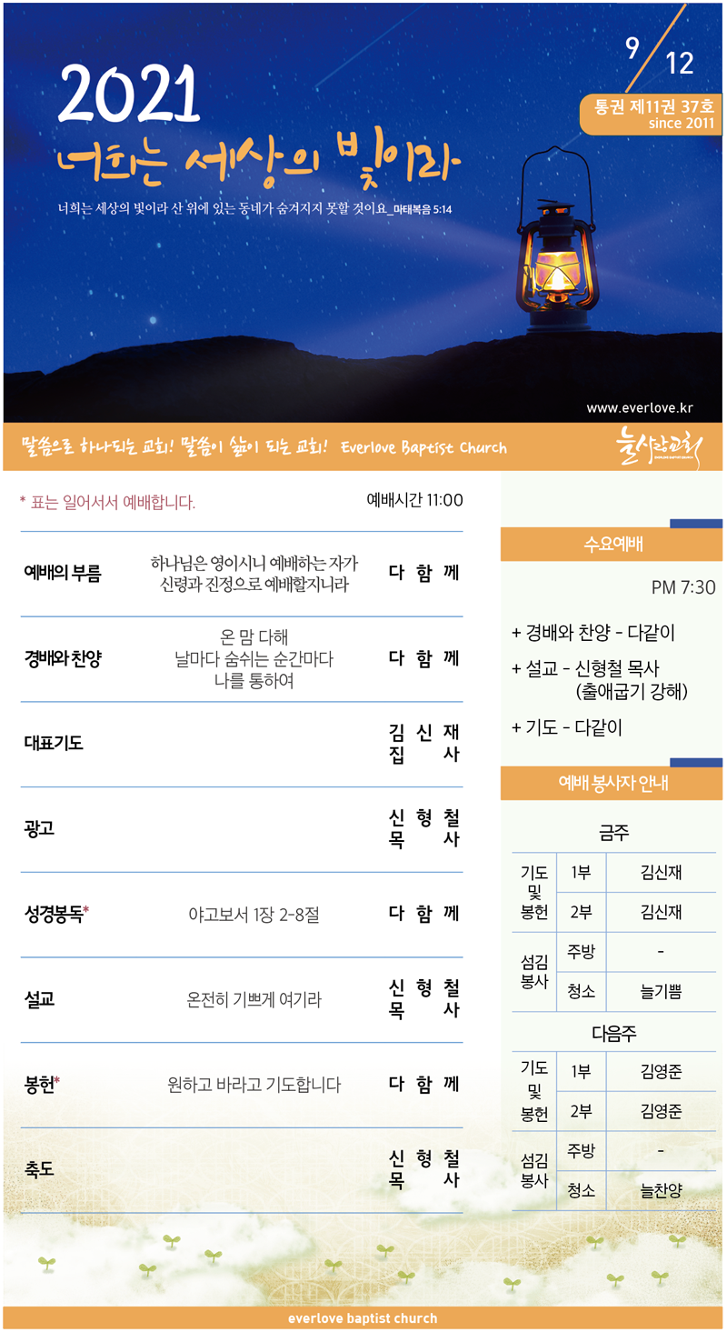 말씀이 삶이되는 늘사랑교회 늘사랑의 다양한 소식들을 전해 드립니다. 예배 순서와 말씀 본문도 보실 수 있습니다. 진행되는 사역들을 위해 함께 기도해 주세요. Tags:계룡교회교회세움감사헌금나를 통하여날마다 숨쉬는 순간마다늘사랑다시고다시꼬독서여행돌;보아모임소식수요저녁예배수험생신형철안내온 맘 다해