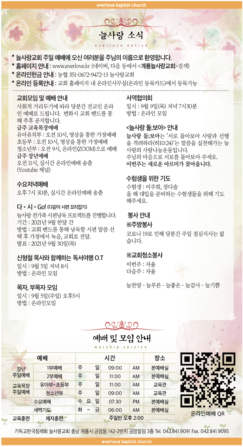 말씀이 삶이되는 늘사랑교회 늘사랑의 다양한 소식들을 전해 드립니다. 예배 순서와 말씀 본문도 보실 수 있습니다. 진행되는 사역들을 위해 함께 기도해 주세요. Tags:2021년O.T계룡교회나는 믿네나의 피난처 예수늘사랑독서여행돌;보아모임목사목자부목자사역협의회수요수험생신형철안내원하고 바라고 기도합니다저녁주의 보혈 능력있도다