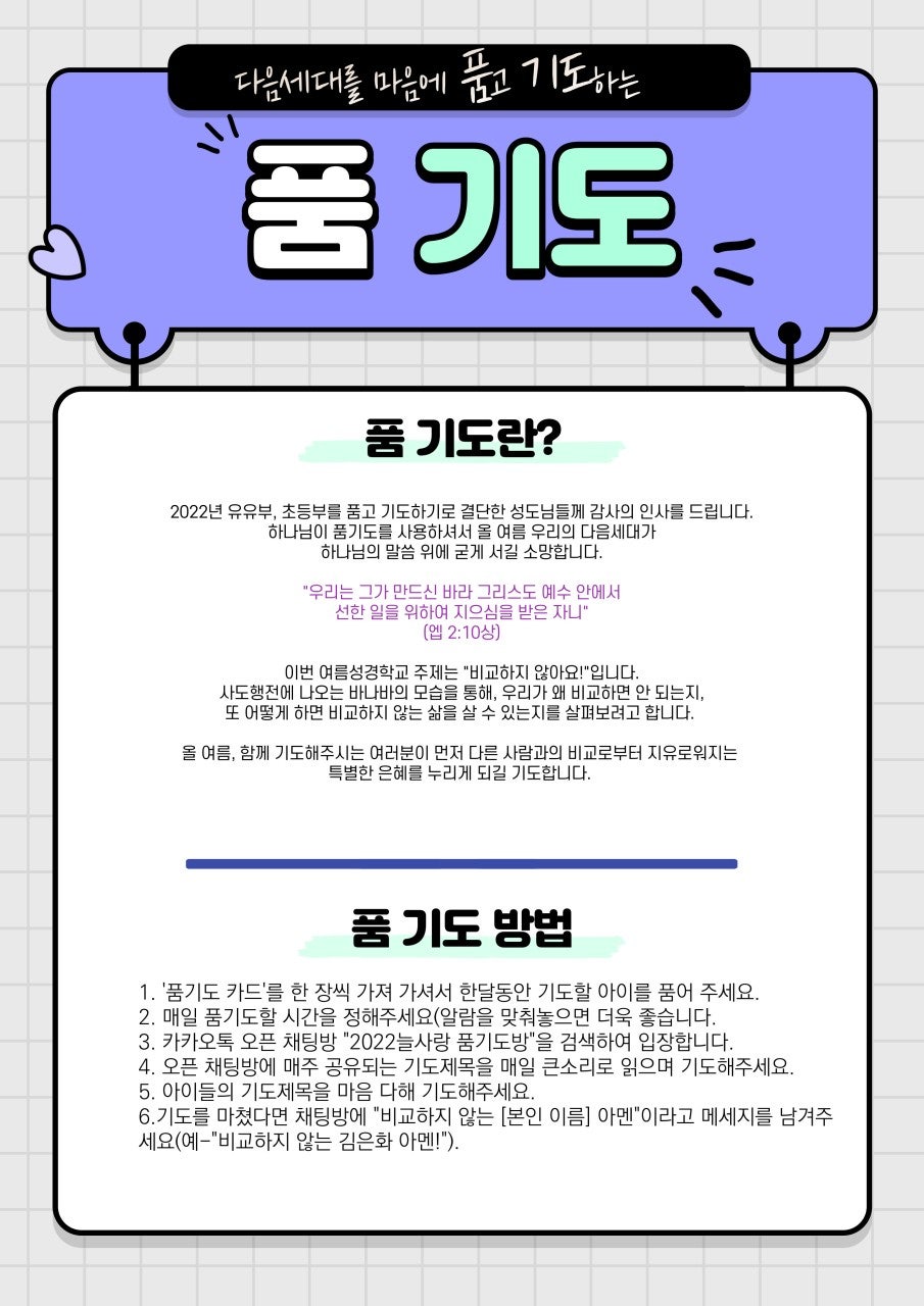 2022 여름성경학교가 시작되었습니다. 우리 아이들이 이번 여름에 더욱 자라나길, 말씀으로 변화되길 기대하며 기도합니다. 이 아름다운 사역에 늘사랑의 지체들을 초대합니다. 오늘 예배시간 에 광고해드린대로 “품기도자”를 모집합니다.