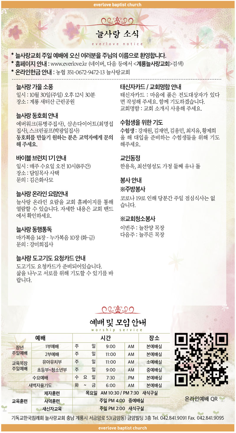 말씀이 삶이되는 늘사랑교회 늘사랑의 다양한 소식들을 전해 드립니다. 예배 순서와 말씀 본문도 보실 수 있습니다. 진행되는 사역들을 위해 함께 기도해 주세요. Tags:1기2022년가을계룡교인동정교회교회명함나는 주님께 속한 자내 영혼의 그윽히 깊은 데서늘사랑도고기도돌동행통독동호회바이블브런치소식소풍수험생온라인온전케 되리요람요청카드은혜태신자카드