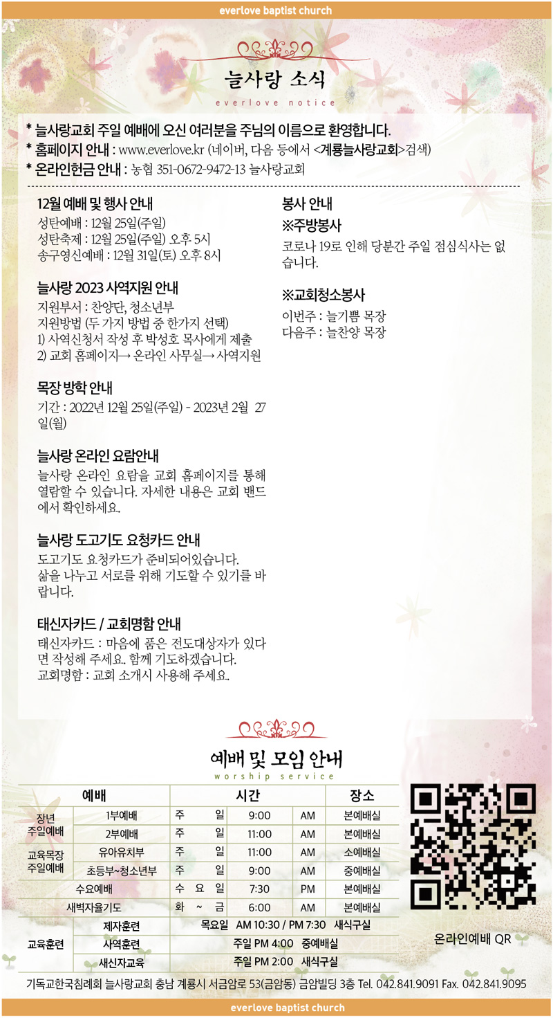 말씀이 삶이되는 늘사랑교회 늘사랑의 다양한 소식들을 전해 드립니다. 예배 순서와 말씀 본문도 보실 수 있습니다. 진행되는 사역들을 위해 함께 기도해 주세요. Tags:12월2022년2023계룡교회교회명함나 가나안 땅 귀한 성에나는 주님께 속한 자늘사랑도고기도목장방학사역지원소식어저께나 오늘이나예배온라인요람요청카드주만 의지해카드태신자행사