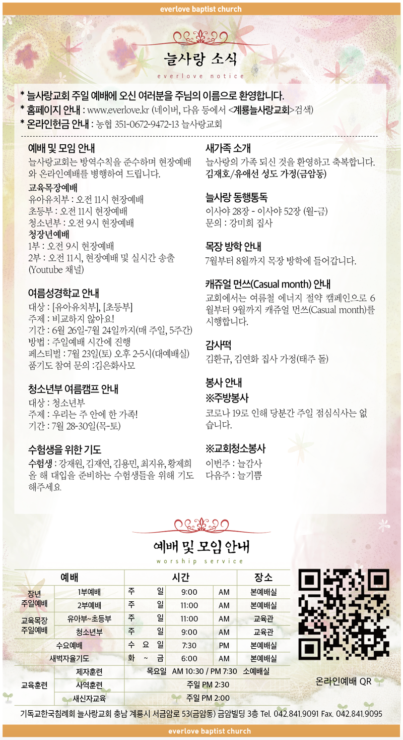 말씀이 삶이되는 늘사랑교회 늘사랑의 다양한 소식들을 전해 드립니다. 예배 순서와 말씀 본문도 보실 수 있습니다. 진행되는 사역들을 위해 함께 기도해 주세요. Tags:2022년감사떡계룡교회나는 주님께 속한 자늘사랑동행통독모든 영광 주 볼 때 가지모임목장방학빈들의 마른 풀 같이새가족소식수험생여름성경학교여름캠프청소년부캐쥬얼먼쓰풀은 마르고
