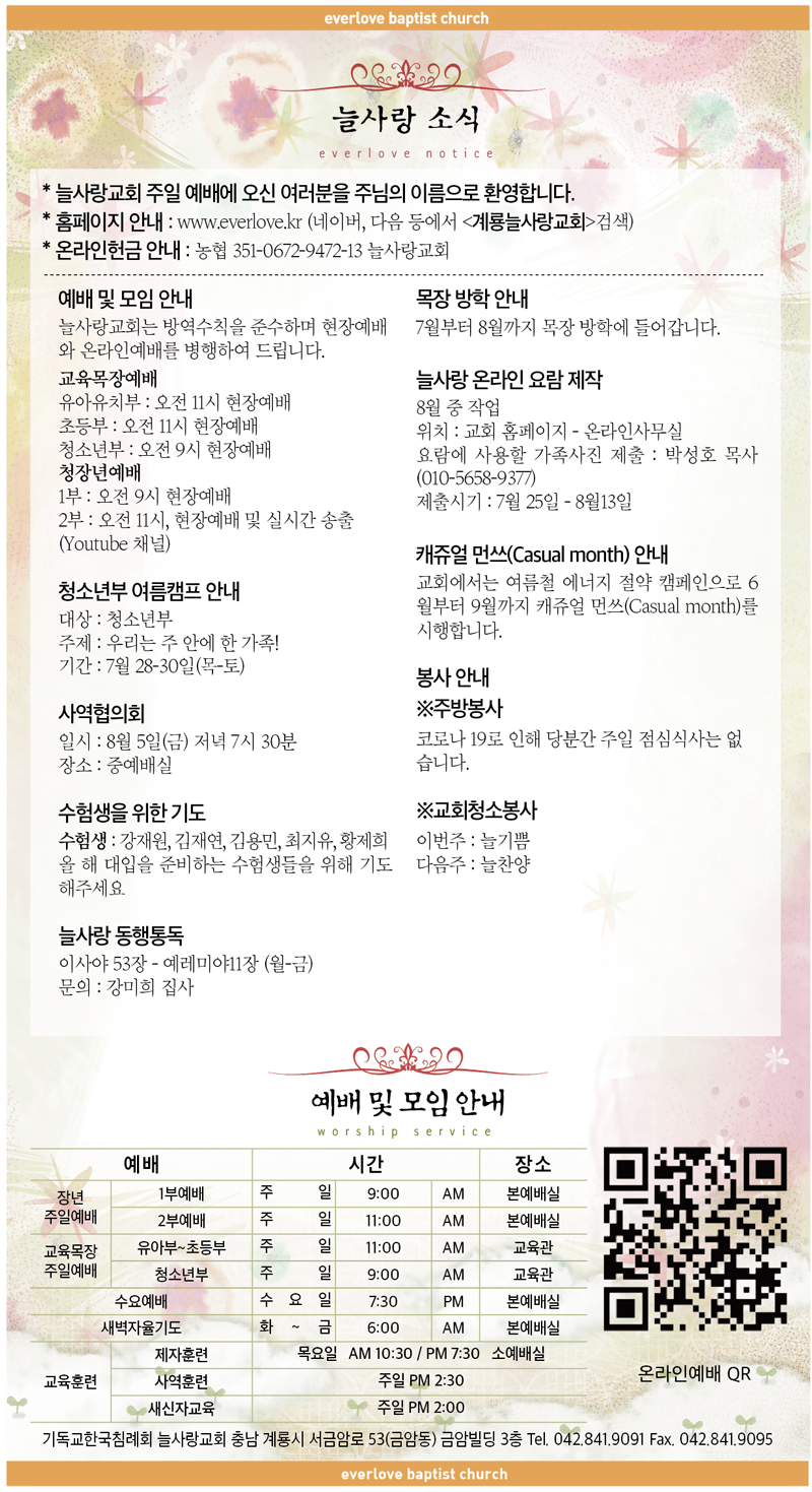 말씀이 삶이되는 늘사랑교회 늘사랑의 다양한 소식들을 전해 드립니다. 예배 순서와 말씀 본문도 보실 수 있습니다. 진행되는 사역들을 위해 함께 기도해 주세요. Tags:2022년계룡교회나는 주님께 속한 자내가 매일 기쁘게늘사랑동행통독목장믿음과 삶방학사역협의회소식수험생여름캠프예배하는 이에게온라인요람제작청소년부캐쥬얼먼스