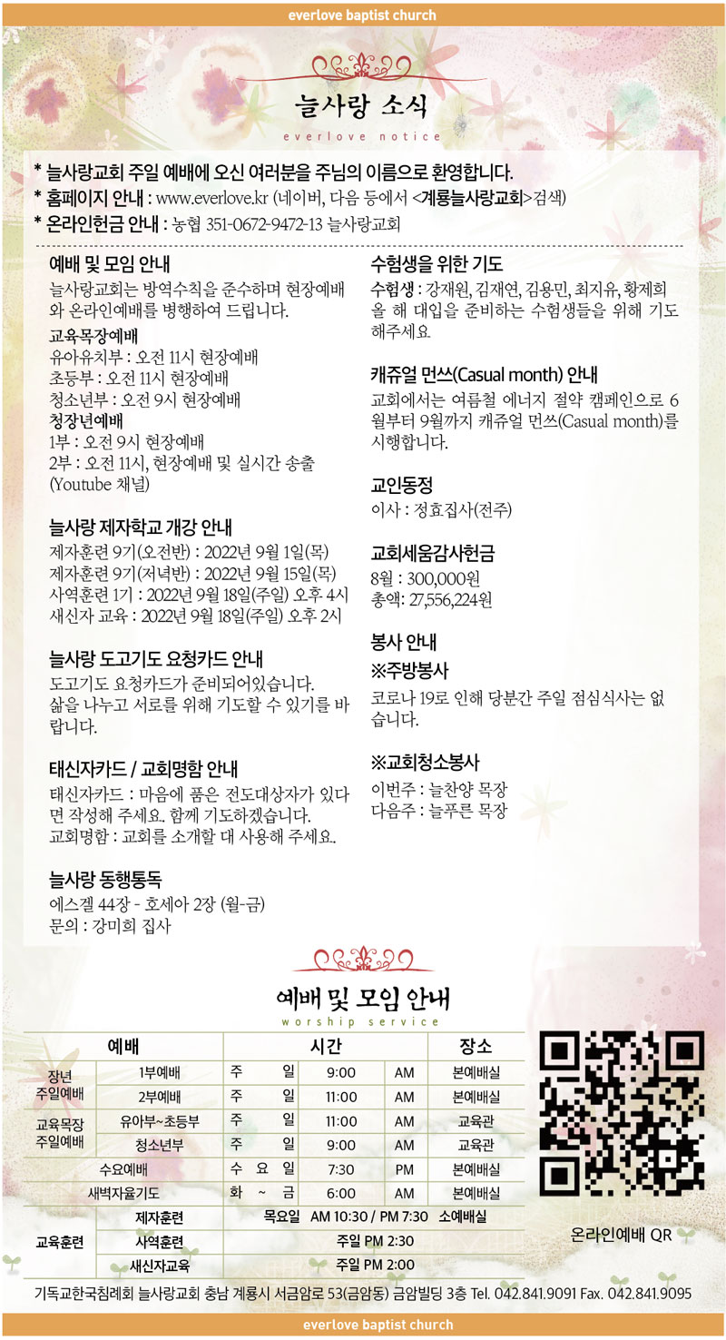 늘사랑의 다양한 소식들을 전해 드립니다. 예배 순서와 말씀 본문도 보실 수 있습니다. 진행되는 사역들을 위해 함께 기도해 주세요.