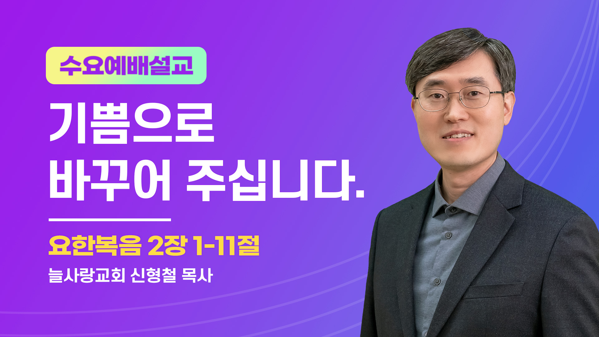 Play VideoPlay Video 본문 : 요한복음 2장 1-11절 제목 : 기쁨으로 바꾸어 주십니다. [요2:1-11] 1 사흘째 되던 날 갈릴리 가나에 혼례가 있어 예수의 어머니도 거기 계시고 2 예수와 그 제자들도 혼례에 청함을 받았더니 3 포도주가 떨어진지라 예수의 어머니가 예수에게 이르되 저들에게 포도주가 없다 하니 4 예수께서 이르시되 여자여 나와 무슨 상관이 있나이까 내 때가 아직 이르지 아니하였나이다 5 그의 어머니가 하인들에게 이르되 너희에게 무슨 말씀을 하시든지 그대로 하라 하니라 6 거기에 유대인의 정결 예식을 따라 두세 통 드는 돌항아리 여섯이 놓였는지라 7 예수께서 그들에게 이르시되 항아리에 물을 채우라 하신즉 아귀까지 채우니 8 이제는 떠서 연회장에게 갖다 주라 하시매 갖다 주었더니 9 연회장은 물로 된 포도주를 맛보고도 어디서 났는지 알지 못하되 물 떠온 하인들은 알더라 연회장이 신랑을 불러 10 말하되 사람마다 먼저 좋은 포도주를 내고 취한 후에 낮은 것을 내거늘 그대는 지금까지 좋은 포도주를 두었도다 하니라 11 예수께서 이 첫 표적을 갈릴리 가나에서 행하여 그의 영광을 나타내시매 제자들이 그를 믿으니라