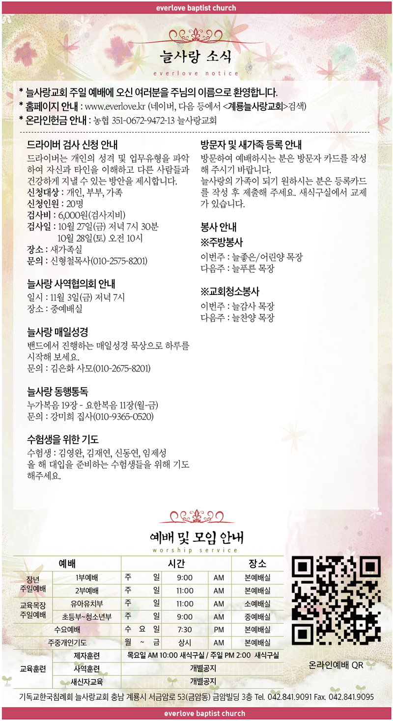 말씀이 삶이되는 늘사랑교회 늘사랑의 다양한 소식들을 전해 드립니다. 예배 순서와 말씀 본문도 보실 수 있습니다. 진행되는 사역들을 위해 함께 기도해 주세요. Tags:2023년검사계룡교회나를 통하여늘사랑동행통독드라이버매일성경방문자사역협의회소식수험생신청예수로 사는 인생이 눈에 아무증거 아니 뵈어도임재