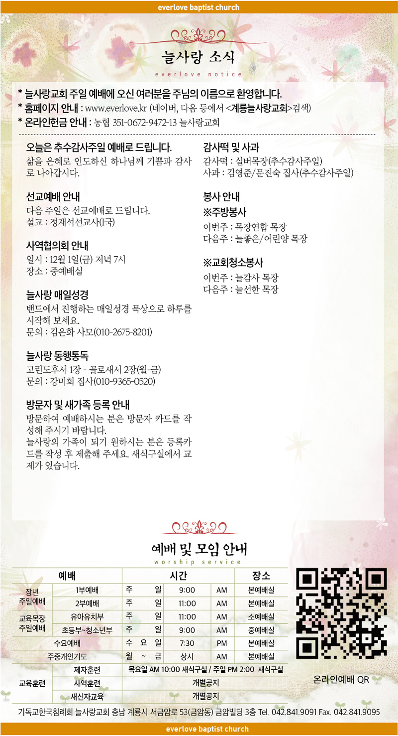 말씀이 삶이되는 늘사랑교회 늘사랑의 다양한 소식들을 전해 드립니다. 예배 순서와 말씀 본문도 보실 수 있습니다. 진행되는 사역들을 위해 함께 기도해 주세요. Tags:2023년감사떡계룡교회늘사랑동행통독매일성경방문자범사에 감사를 주심 믿네사과사역협의회선교예배세상 모든 풍파 너를 흔들어예수로 사는 인생은혜추수감사주일