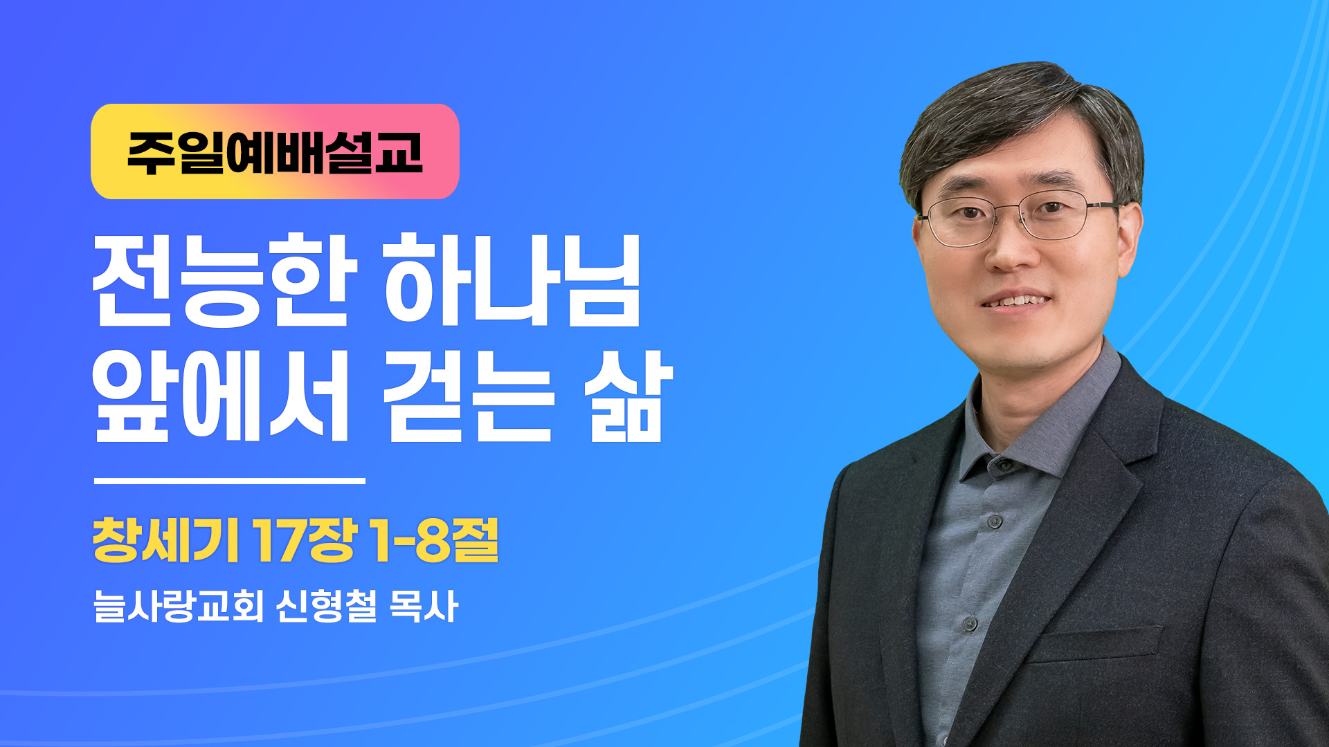Play VideoPlay Video 본문 : 창세기 17장 1-8절 제목 : 전능한 하나님 앞에서 걷는 삶 [창17:1-8] 1 아브람이 구십구 세 때에 여호와께서 아브람에게 나타나서 그에게 이르시되 나는 전능한 하나님이라 너는 내 앞에서 행하여 완전하라 2 내가 내 언약을 나와 너 사이에 두어 너를 크게 번성하게 하리라 하시니 3 아브람이 엎드렸더니 하나님이 또 그에게 말씀하여 이르시되 4 보라 내 언약이 너와 함께 있으니 너는 여러 민족의 아버지가 될지라 5 이제 후로는 네 이름을 아브람이라 하지 아니하고 아브라함이라 하리니 이는 내가 너를 여러 민족의 아버지가 되게 함이니라 6 내가 너로 심히 번성하게 하리니 내가 네게서 민족들이 나게 하며 왕들이 네게로부터 나오리라 7 내가 내 언약을 나와 너 및 네 대대 후손 사이에 세워서 영원한 언약을 삼고 너와 네 후손의 하나님이 되리라 8 내가 너와 네 후손에게 네가 거류하는 이 땅 곧 가나안 온 땅을 주어 영원한 기업이 되게 하고 나는 그들의 하나님이 되리라