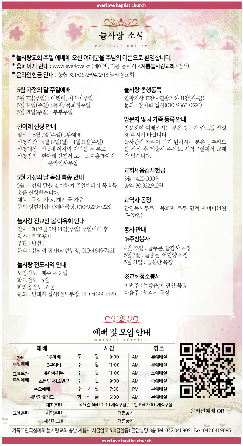말씀이 삶이되는 늘사랑교회 늘사랑의 다양한 소식들을 전해 드립니다. 예배 순서와 말씀 본문도 보실 수 있습니다. 진행되는 사역들을 위해 함께 기도해 주세요. Tags:2023년5월가정의 달계룡교역자 동정교회교회세움감사헌금늘사랑동행통독등록방문자봄 야유회새가족소식신청예수 닮기를예수로 사는 인생전교인전도사역주님 약속하신 말씀 위에 서충만특송헌아례