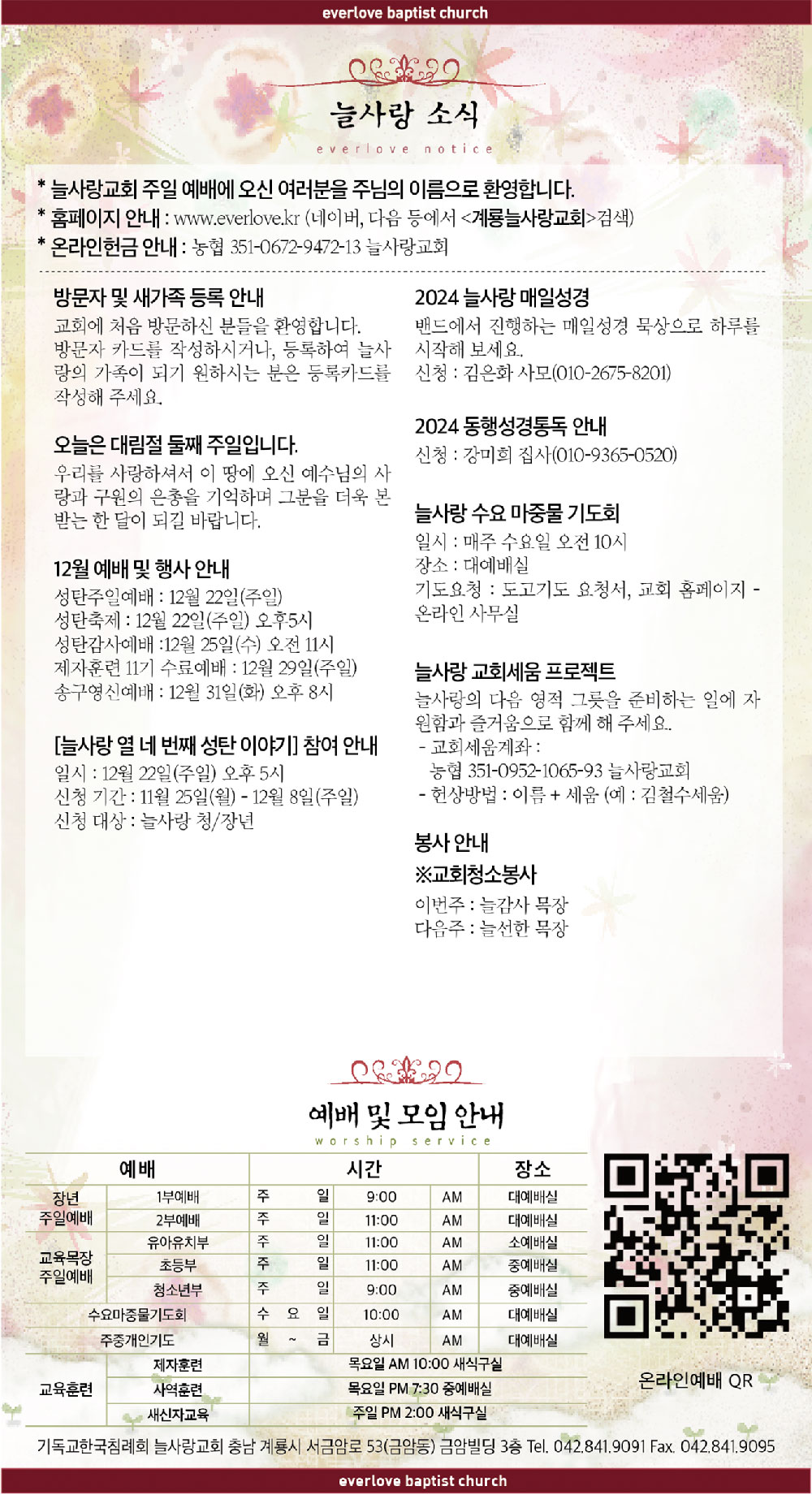 말씀이 삶이되는 늘사랑교회 늘사랑의 다양한 소식들을 전해 드립니다. 예배 순서와 말씀 본문도 보실 수 있습니다. 진행되는 사역들을 위해 함께 기도해 주세요. Tags:내 주를 가까이 하게 함은늘사랑 교회세움 프로젝트늘사랑 열 네 번째 성탄 이야기 참여 안내성탄감사예배 : 12월 25일(수)성탄주일예배 : 12월 22일성탄축제 : 12월 22일(주일)송구영신예배 : 12월 31일(화)여호와의 이름을 망령되게 부르지 말라오늘은 대림절 둘째 주일입니다제자훈련 11기 수료예배주 안에 있는 나에게주님을 예배하는 것출애굽기 20장 7절