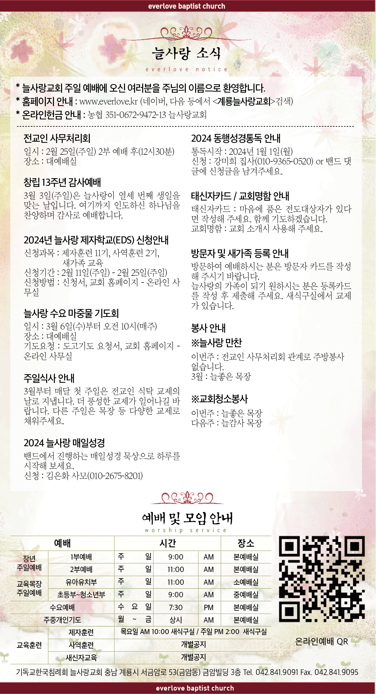 말씀이 삶이되는 늘사랑교회 늘사랑의 다양한 소식들을 전해 드립니다. 예배 순서와 말씀 본문도 보실 수 있습니다. 진행되는 사역들을 위해 함께 기도해 주세요. Tags:2024 늘사랑 매일성경2024 동행성경통독2024년 2월 25일2024년 늘사랑 제자학교(EDS)감사예배교회명함그래도 하나님은 일하십니다나를 부르신 주늘사랑 만찬늘사랑 수요 마중물 기도회도고기도 요청서마음 속에 근심 있는 사람매달 첫 주일 전교인 식탁 교제사역훈련 2기새가족 교육슬픔 마음 있는 자전교인 사무처리회제자훈련 11기창립13주년출 1장 1-14절태신자카드