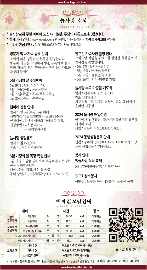 말씀이 삶이되는 늘사랑교회 늘사랑의 다양한 소식들을 전해 드립니다. 예배 순서와 말씀 본문도 보실 수 있습니다. 진행되는 사역들을 위해 함께 기도해 주세요. Tags:2024년 4월 28일 교회주보5월 가정의 달5월 가정의 달 목장 특송5월5일 늘사랑 식탁 교제교회요람 작업구주 예수 의지함이늘사랑 수요 마중물 기도회늘사랑 힐링캠프예수 피 밖에장령산자연휴양림전교인 가족사진 촬영 안내출애굽기 4장 18-31절충만하나님의 돕는 손이 함께 합니다헌아례 신청