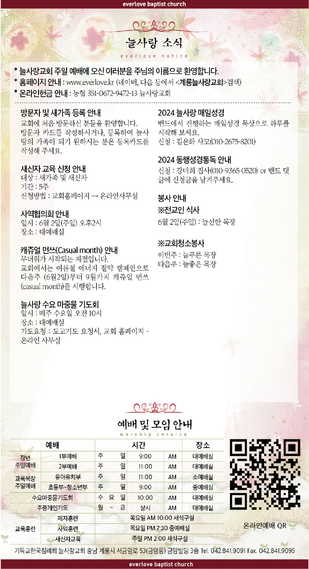말씀이 삶이되는 늘사랑교회 늘사랑의 다양한 소식들을 전해 드립니다. 예배 순서와 말씀 본문도 보실 수 있습니다. 진행되는 사역들을 위해 함께 기도해 주세요. Tags:2024 늘사랑 매일성경2024 동행성경통독 안내2024년 6월2일 교회주보6월 전교인 식사거룩 거룩 거룩 전능하신 주님교만에서 돌아서야 합니다나는 주를 섬기는 것에 후회가 없습니다나의 하나님늘사랑 수요 마중물 기도회사역협의회 안내새신자 교육 신청주 여호와는 광대하시도다출애굽기 9장 13-35절캐쥬얼 먼쓰