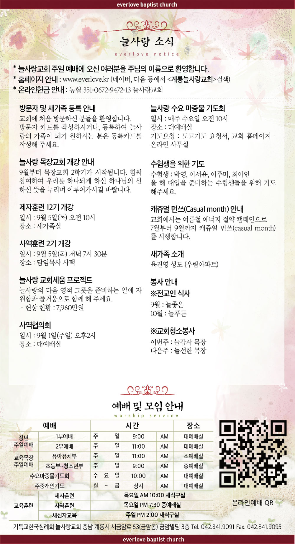 말씀이 삶이되는 늘사랑교회 늘사랑의 다양한 소식들을 전해 드립니다. 예배 순서와 말씀 본문도 보실 수 있습니다. 진행되는 사역들을 위해 함께 기도해 주세요. Tags:늘사랑 목장교회 개강 안내늘사랑 수요 마중물 기도회로마서 6장 15-23절모든 걸음 죄시네사역협의회사역훈련 2기 개강새가족 소개(육진영 성도)수험생을 위한 기도시편 139편예수를 나의 구주삼고의에게 내주어 거룩함에 이르라전교인 식사 9월 늘좋은제자훈련 12기 개강침례식캐쥬얼 먼쓰 안내하늘 위에 주님 밖에