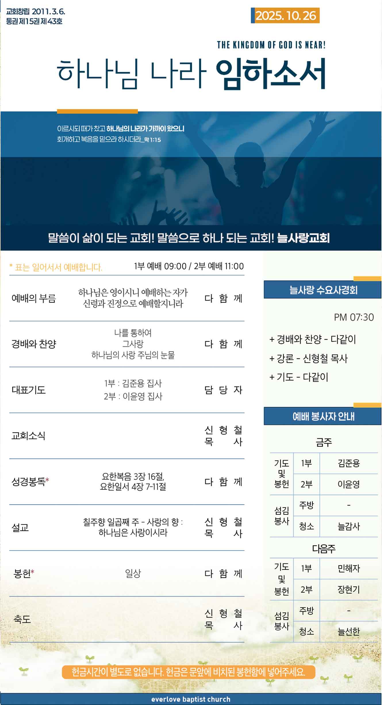 말씀이 삶이되는 늘사랑교회 늘사랑의 다양한 소식들을 전해 드립니다. 예배 순서와 말씀 본문도 보실 수 있습니다. 진행되는 사역들을 위해 함께 기도해 주세요. Tags:2025 추수감사주일 안내그 사랑나를 통하여늘사랑 모퉁이돌 프로젝트 안내늘사랑 사역협의회늘사랑 새생명 축제 안내늘사랑 수요사경회 안내요한복음 3장 16절요한일서 4장 7-11절제10차 다니엘 특별새벽기도회 안내칠주향 - 7주간의 향기로운 초대칠주향 일곱째 주 - 사랑의 향하나님은 사랑이시라하나님의 사랑 주님의 눈물