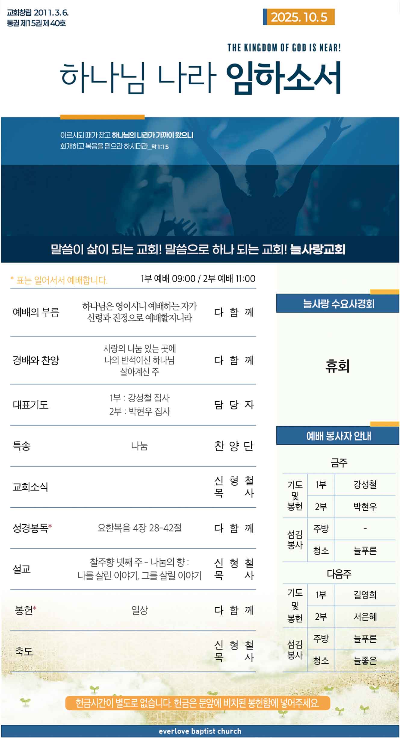 말씀이 삶이되는 늘사랑교회 늘사랑의 다양한 소식들을 전해 드립니다. 예배 순서와 말씀 본문도 보실 수 있습니다. 진행되는 사역들을 위해 함께 기도해 주세요. Tags:그를 살릴 이야기나눔나의 반석이신 하나님사랑의 나눔 있는 곳에살아계신 주요한복음 4장 28-42절칠주향 넷째 주 - 나눔의 향 : 나를 살린 이야기