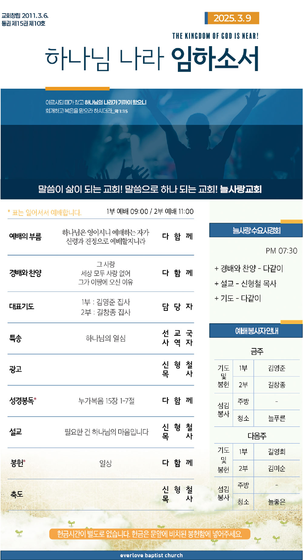 말씀이 삶이되는 늘사랑교회 늘사랑의 다양한 소식들을 전해 드립니다. 예배 순서와 말씀 본문도 보실 수 있습니다. 진행되는 사역들을 위해 함께 기도해 주세요. Tags:그 사랑그가 이땅에 오신 이유누가복음 15장 1-7절늘.기.도. 금요기도회 안내늘사랑 교회세움 프로젝트늘사랑 사역협의회늘사랑 수요 사경회 안내사순절 및 부활주일 안내새생명 축제 출정예배 안내세상 모두 사랑 없어일상제자훈련 12기 오리엔테이션필요한 건 하나님의 마음입니다하나님의 열심 특송