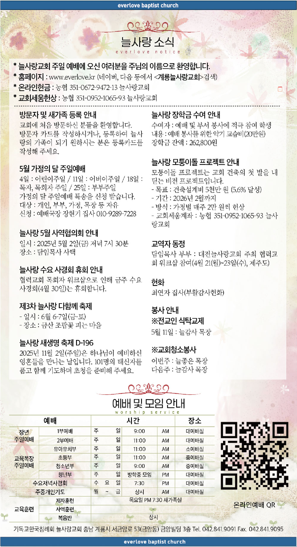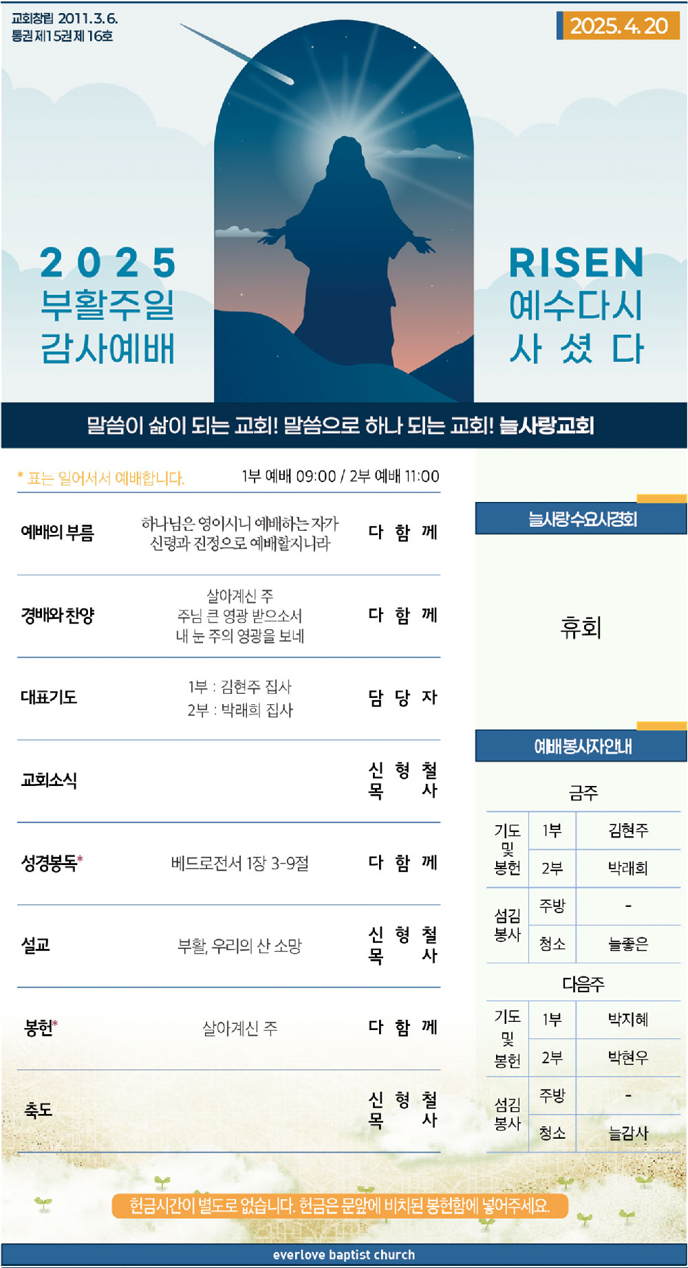 말씀이 삶이되는 늘사랑교회 늘사랑의 다양한 소식들을 전해 드립니다. 예배 순서와 말씀 본문도 보실 수 있습니다. 진행되는 사역들을 위해 함께 기도해 주세요. Tags:5월 가정의 달 주일예배교역자 동정내 눈 주의 영광을 보네늘사랑 5월 사역협의회 안내늘사랑 모퉁이돌 프로젝트 안내늘사랑 새생명 축제 D-196늘사랑 수요 사경회 휴회 안내늘사랑 장학금 수여 안내베드로전서 1장 3-9절부활살아계신 주우리의 산 소망전교인 식탁교제제3차 늘사랑 다함께 축제주님 큰 영광 받으소서