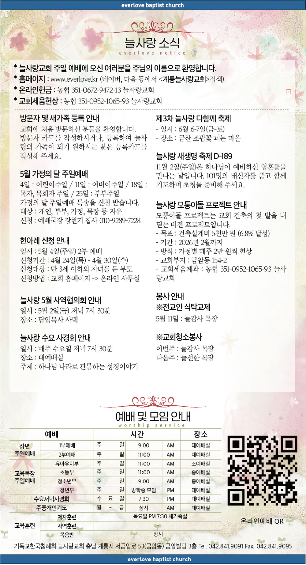 말씀이 삶이되는 늘사랑교회 늘사랑의 다양한 소식들을 전해 드립니다. 예배 순서와 말씀 본문도 보실 수 있습니다. 진행되는 사역들을 위해 함께 기도해 주세요. Tags:5월 가정의 달 주일예배늘사랑 5월 사역협의회 안내늘사랑 모퉁이돌 프로젝트 안내늘사랑 새생명 축제 D-189늘사랑 수요 사경회 안내요한복음 3장 1-8절우리 주 하나님일상제3차 늘사랑 다함께 축제주님 곁으로 날 이끄소서주님 말씀하시면하나님 나라의 첫걸음 : 거듭남헌아례 신청 안내