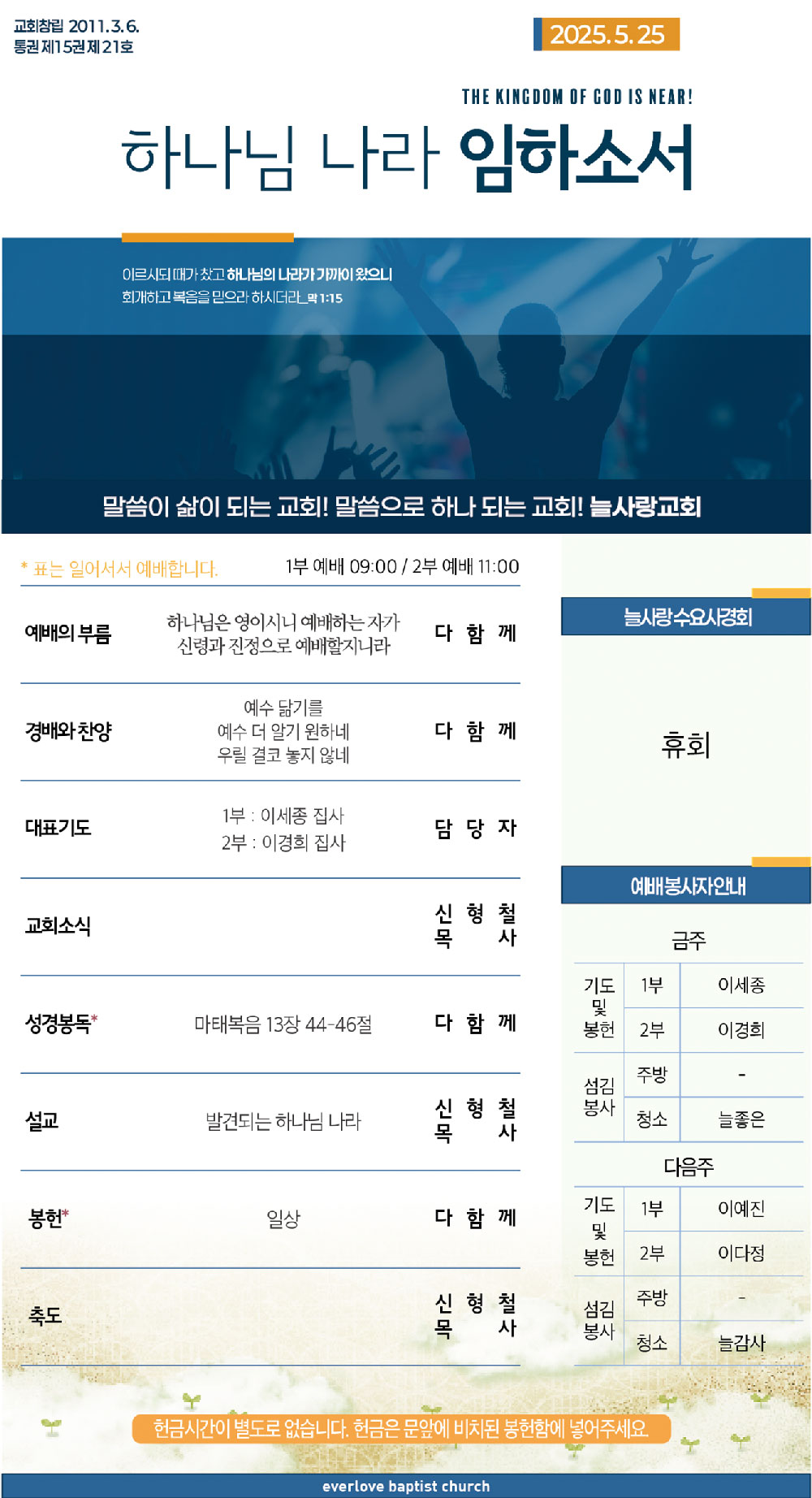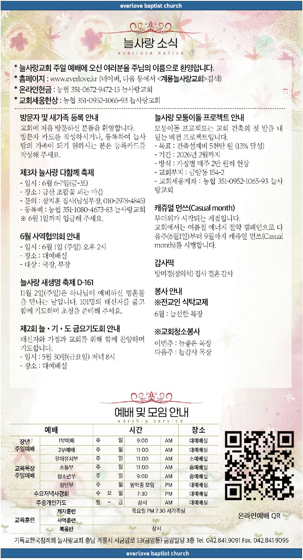 말씀이 삶이되는 늘사랑교회 늘사랑의 다양한 소식들을 전해 드립니다. 예배 순서와 말씀 본문도 보실 수 있습니다. 진행되는 사역들을 위해 함께 기도해 주세요. Tags:6월 사역협의회 안내감사떡늘사랑 모퉁이돌 프로젝트 안내늘사랑 새생명 축제 D-161마태복음 13장 44-46절발견되는 하나님 나라예수 닮기를예수 더 알기 원하네우릴 결코 놓지 않네일상제2회 늘기도 금요기도회 안내제3차 늘사랑 다함께 축제캐쥬얼 먼쓰(Casual month)
