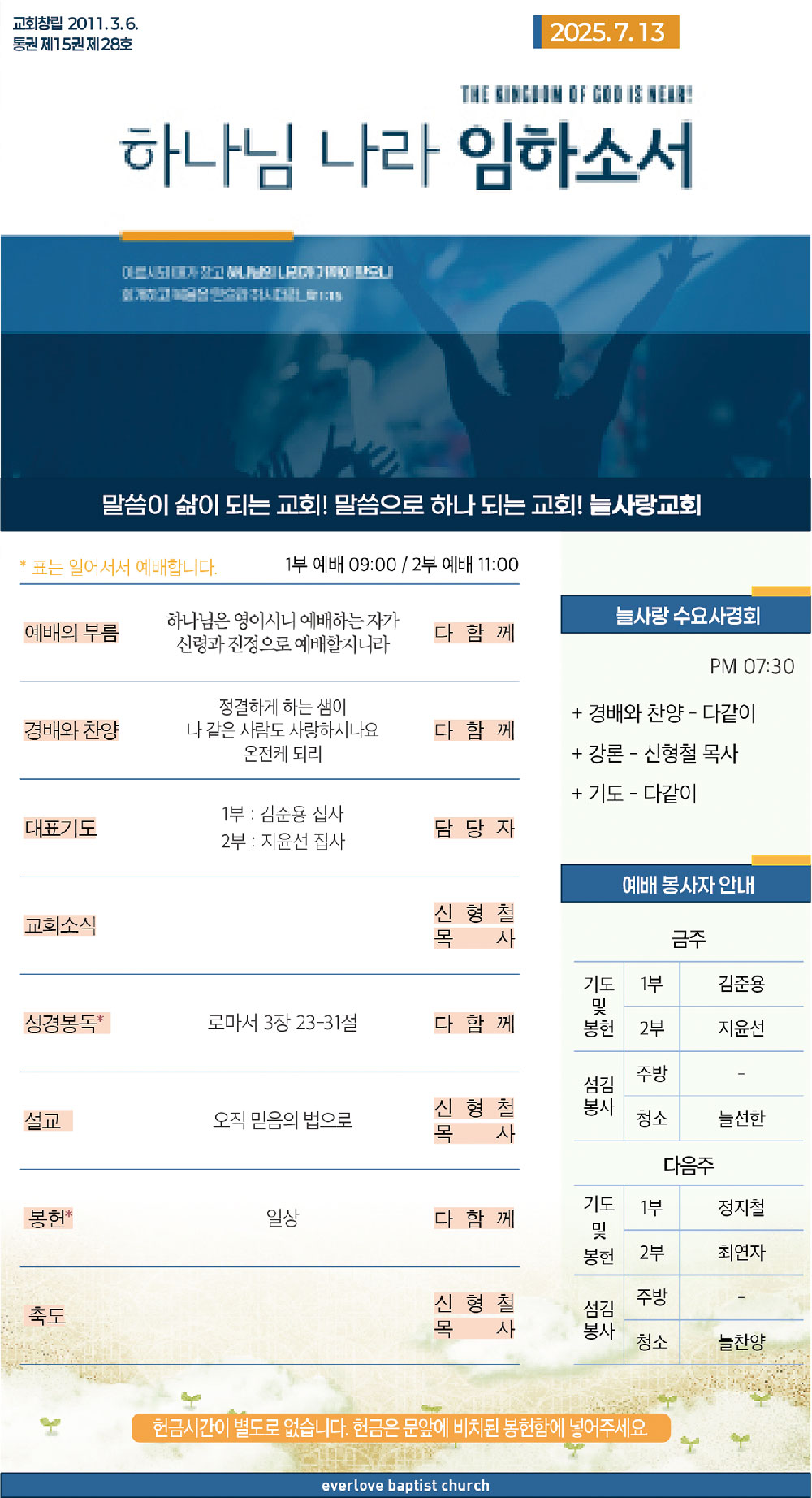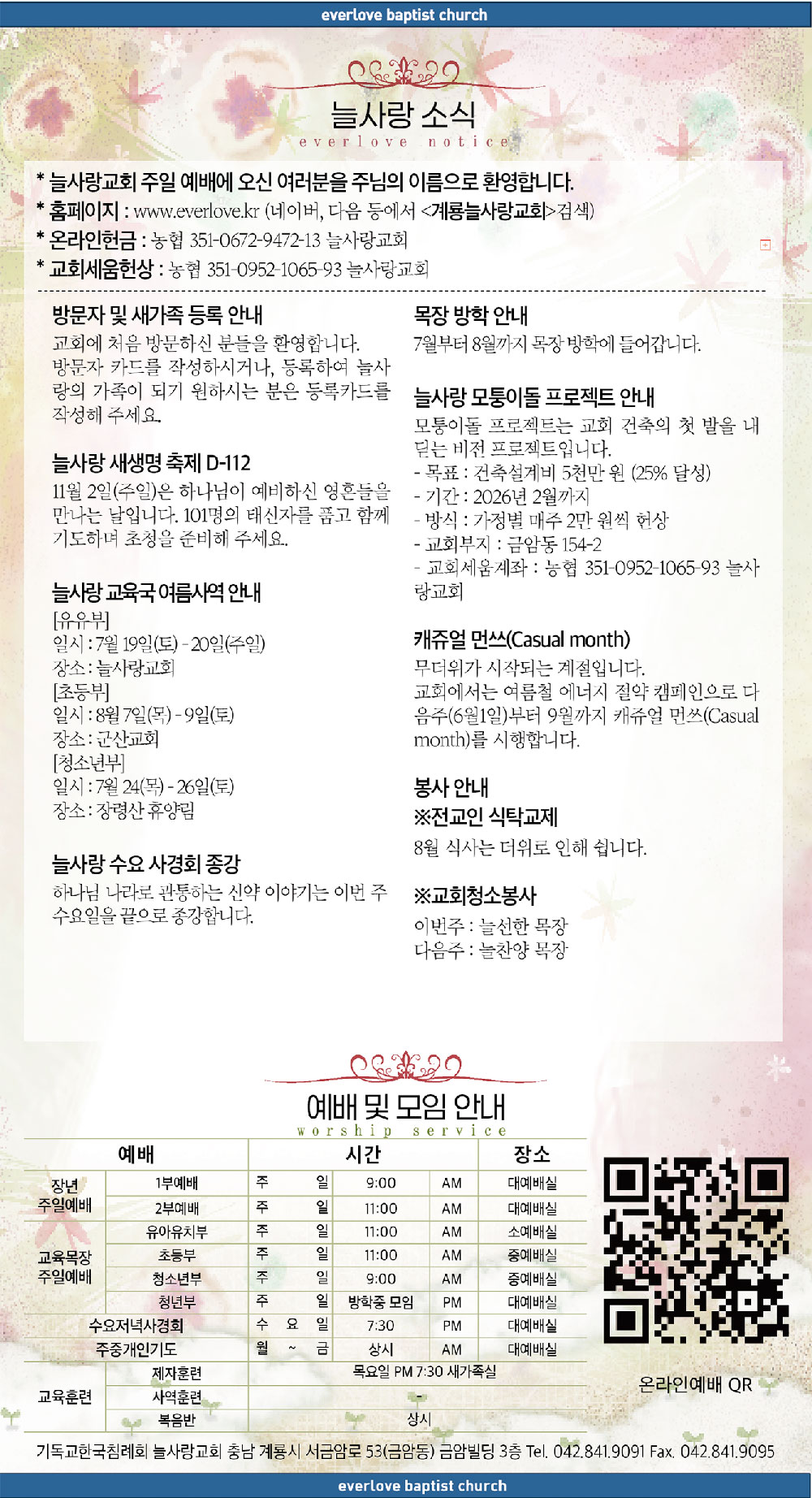말씀이 삶이되는 늘사랑교회 늘사랑의 다양한 소식들을 전해 드립니다. 예배 순서와 말씀 본문도 보실 수 있습니다. 진행되는 사역들을 위해 함께 기도해 주세요. Tags:나 같은 사람도 사랑하시나요늘사랑 교육국 여름사역 안내늘사랑 새생명 축제 D-112늘사랑 수요 사경회 종강로마서 3장 23-31절오직 믿음의 법으로온전케 되리정결하게 하는 샘이