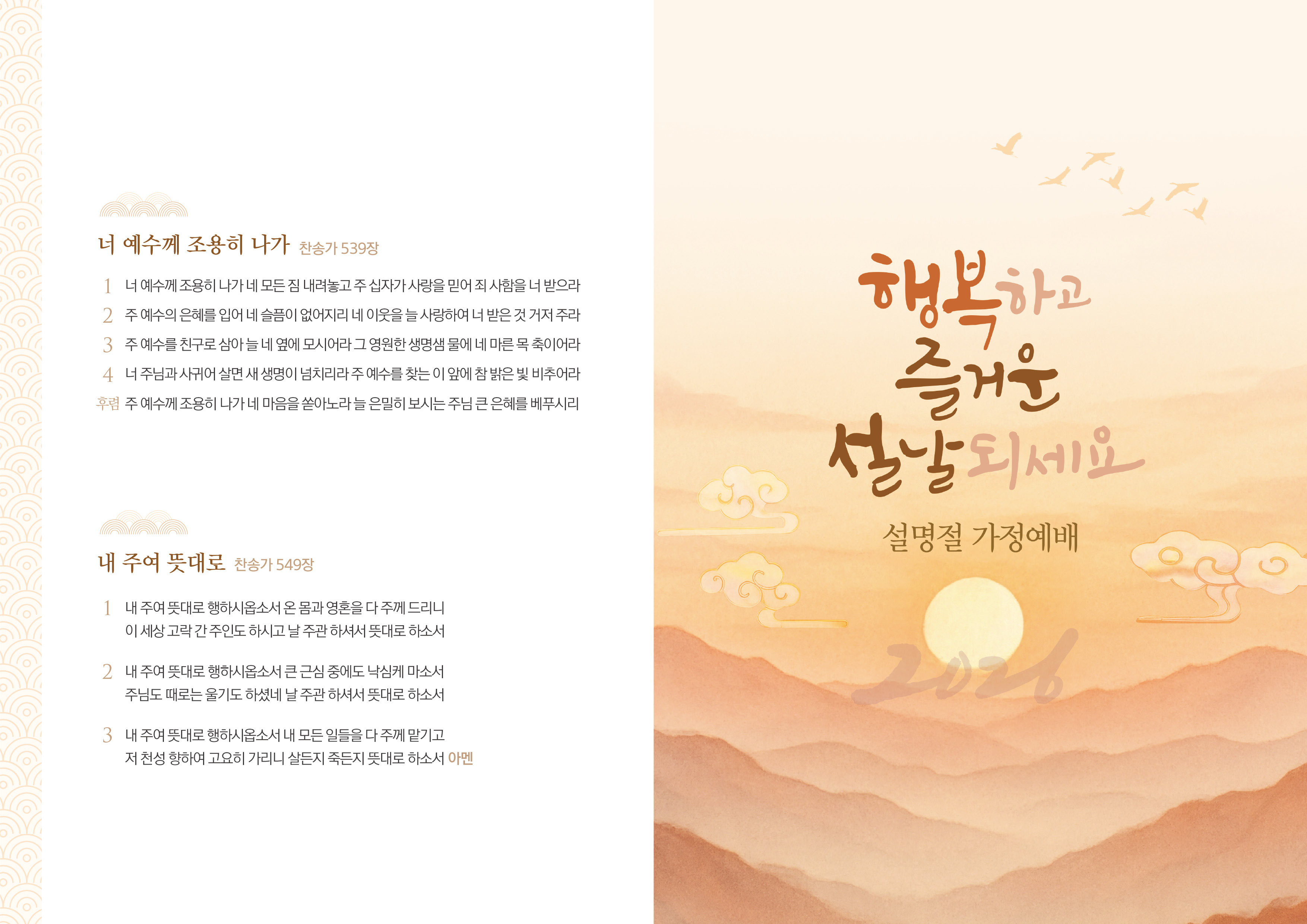 설 명절에 온 가족이 함께 예배할 수 있는 가정예배 순서지입니다. 다운 받은 후 출력해서 사용하세요. 설 명절에 온 가족이 함께 예배할 수 있는 가정예배 순서지입니다. 다운 받은 후 출력해서 사용하세요. ☑️ 순서지 겉지 : 이미지 다운로드 하기 ☑️ 순서지 속지 : 이미지 다운로드 하기 ☑️ PDF로 한 번에 다운로드 하기 목록으로 돌아가기