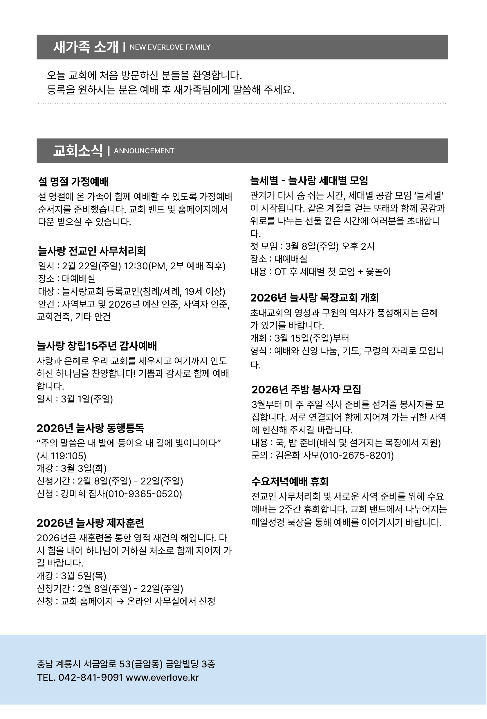 늘사랑의 다양한 소식들을 전해 드립니다. 예배 순서와 말씀 본문도 보실 수 있습니다. 진행되는 사역들을 위해 함께 기도해 주세요.